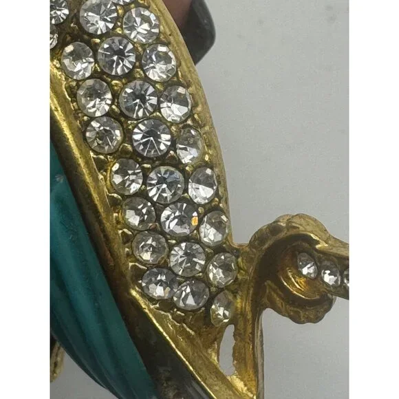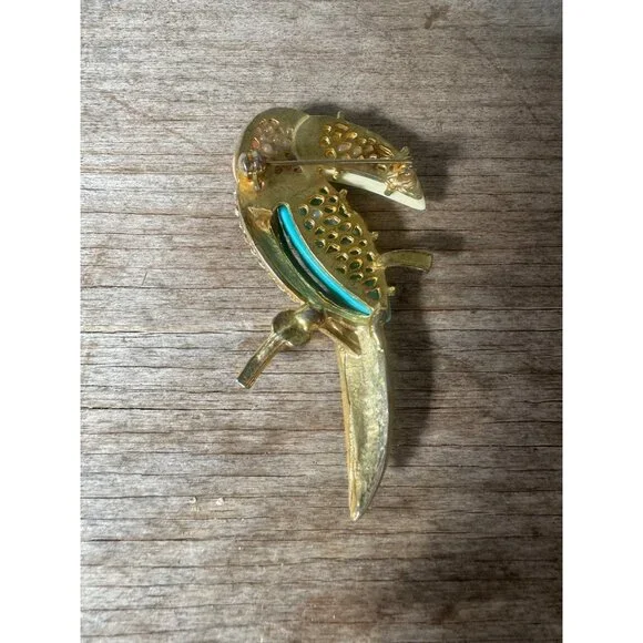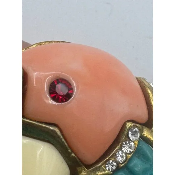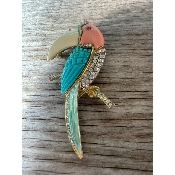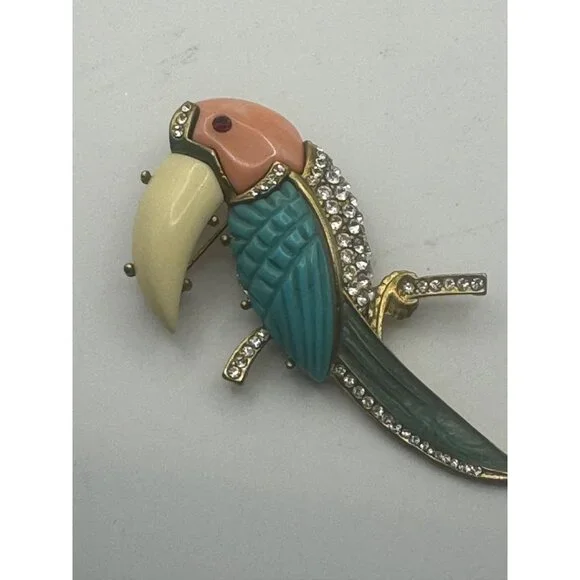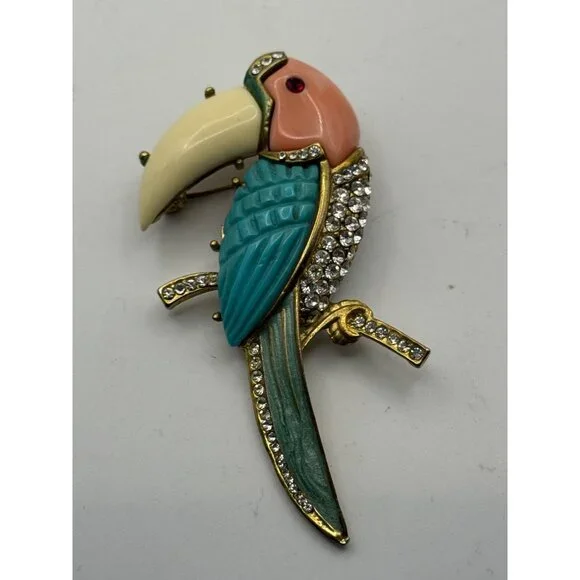 Fabulous Hattie Carnegie toucan bird pin brooch. The pin is gold tone metal with coral, turquoise and off white resin or think plastic material, clear glass rhinestones and turquoise enamel. The toucan bird has a red rhinestone eye. Measures approximately 3 3/8 inches by 1 3/4 inches. this pin is an unsigned Hattie Carnegie In EXCELLENT condition with no missing stones, enamel or breaks or repairs of any kind.Size: Womens 3 3/8"Condition: Pre-Owned GoodGood condition as pictured