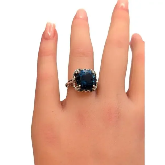 London Blue Topaz 925 Sterling Silver Filigree Ring 4.2g Size 5.5. Gorgeous stone and setting. Was sold to me as a blue spinel, but I am listing it as a London Blue Topaz because the color is more in keeping with that stone. Pre-owned, this ring is in excellent condition. So feminine. I believe this stone is about 7 carats, but don´t hold me to that. It is approximately 12mm.26