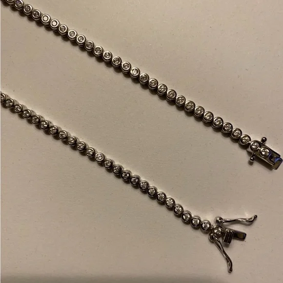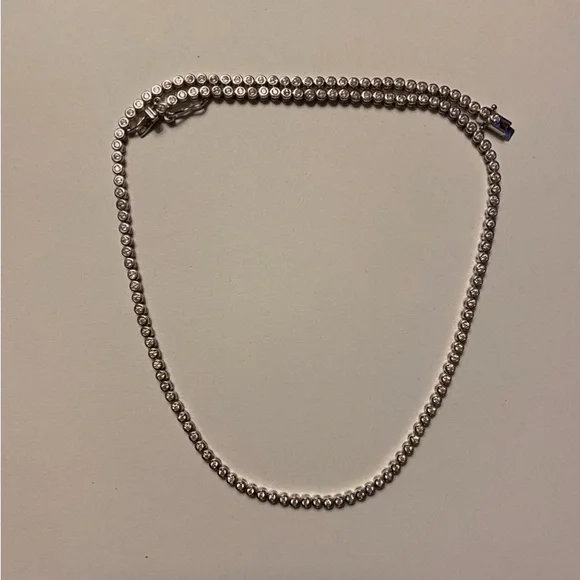 Top quality bezel settings tennis necklace with sparkling finest lab created diamonds in sterling silver, stamped 925Stone Size: 2mmTotal Weight: 13 carat Length: 18 inches