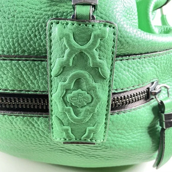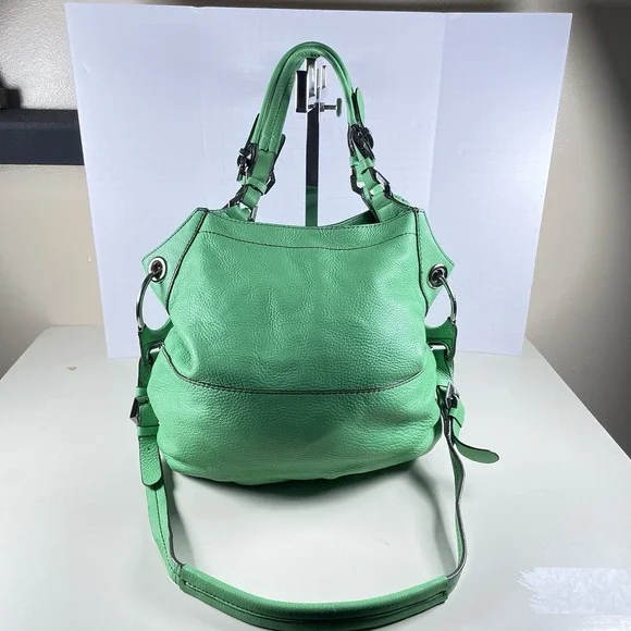 Statement piece alert — this bold and vibrant green OrYANY leather shoulder bag features genuine pebbled leather with silver-tone hardware, oversized grommet details, and a...