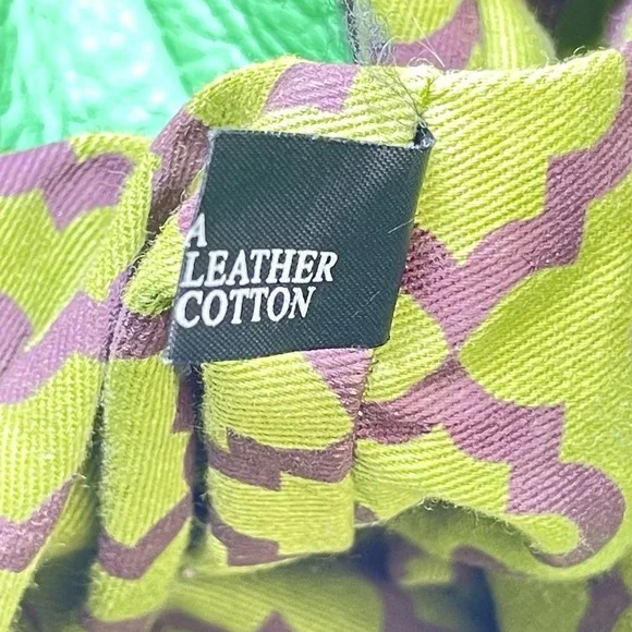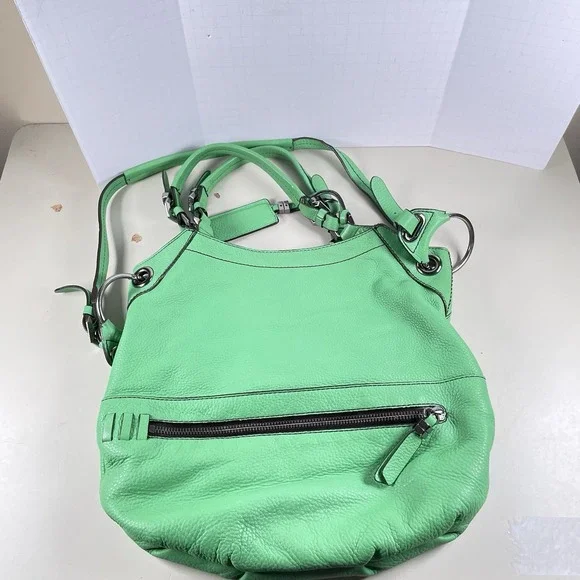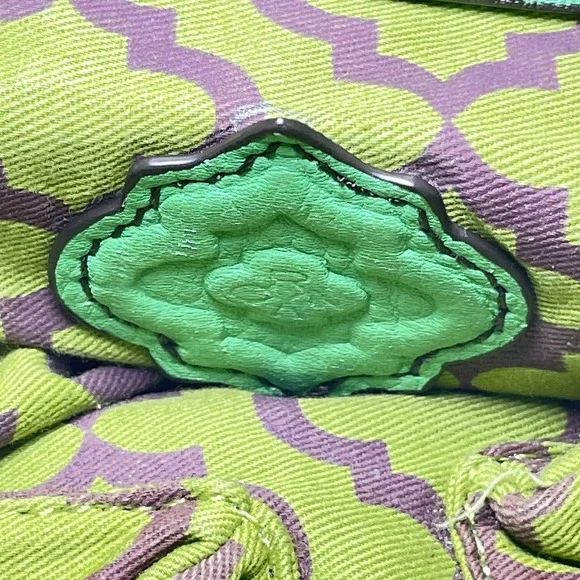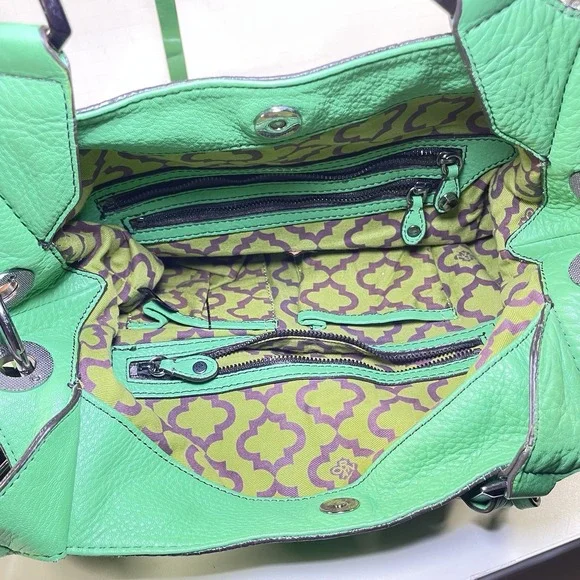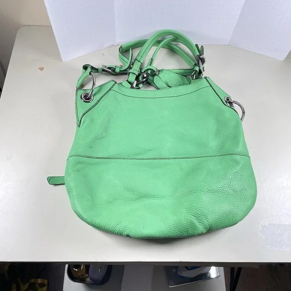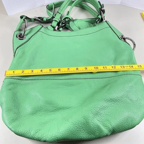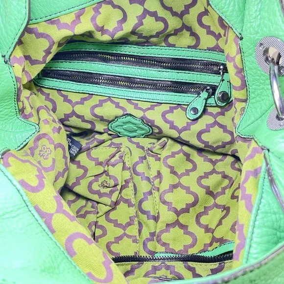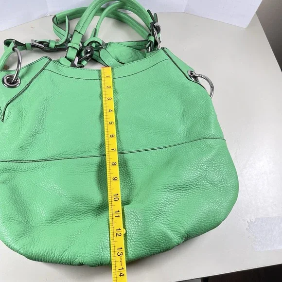 Statement piece alert — this bold and vibrant green OrYANY leather shoulder bag features genuine pebbled leather with silver-tone hardware, oversized grommet details, and a signature embossed leather medallion. Interior is fully lined in a striking lime-and-plum geometric cotton print with multiple interior pockets for functionality.Convertible carry options include rolled double handles and a detachable, adjustable crossbody strap. Style code SDL402 is printed on the interior tag, confirming authenticity.Pre-owned in excellent condition with minor wear on hardware. Clean lining, working zippers, and no tears or odors.⸻Keywords:OrYANY leather baggreen slouchy pursedesigner crossbodyboho pebbled leather bagembossed leather logoNYC handbag brandbold color pursefestival-ready handbagSDL402 stylestructured hobo tote⸻Measurements:• Width: 14.5 in• Height: 13 in• Depth: 4.5 in• Strap drop (handles): 9 in• Adjustable crossbody strap: 22–26 in• Material: 100% genuine leather exterior, 100% cotton lining• Style code: SDL402• Color: Bright green• Closure: Top snap + zip pocket