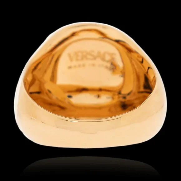 Versace Gold Color Metal Logo Engraved Statement Ring Sz 23Product DetailsRetail Value: $380.00This is authentic Versace Gold Color Metal Logo Engraved Statement RingSKU: ST-2994SKU2: 07.02.25.75Country/Region of Manufacture ItalyModel: DG57285 DJMR 4J6200
