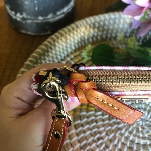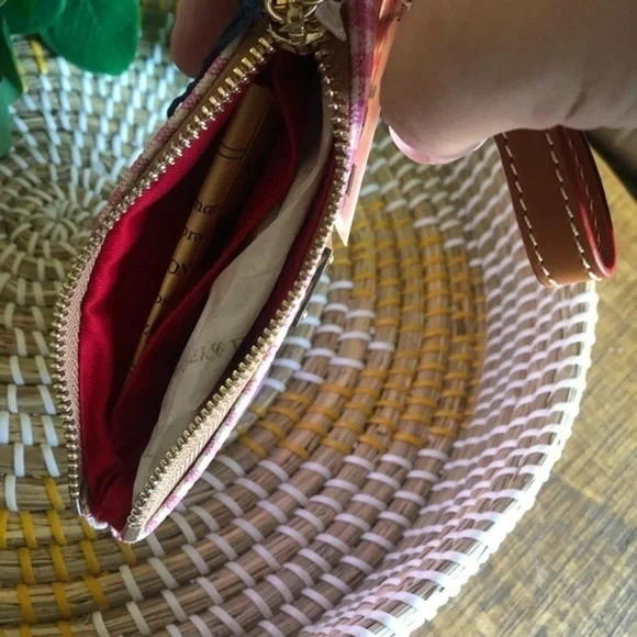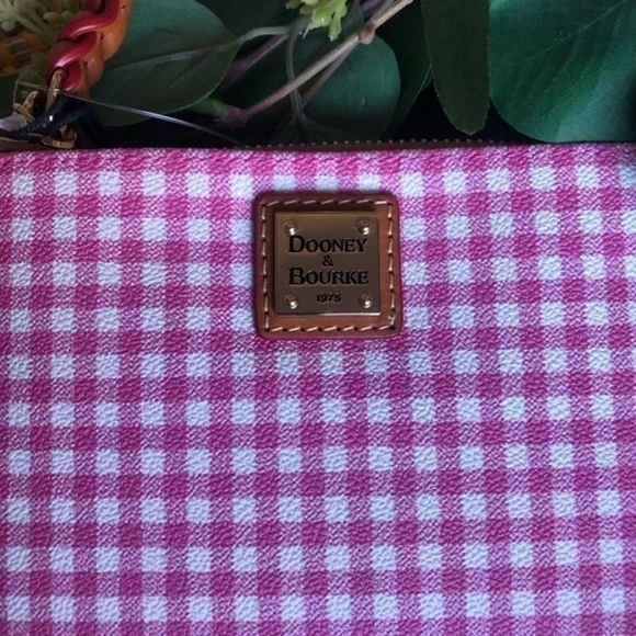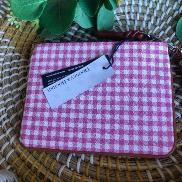 New never used authentic pink gingham Dooney and Bourke wristlet. Roughly 6 inches long by 5 inches wide. Comes with registration card as well! Red interior with 4 card pocket slots inside with an additional large one on the opposite inner side. wrist strap is also detachable.