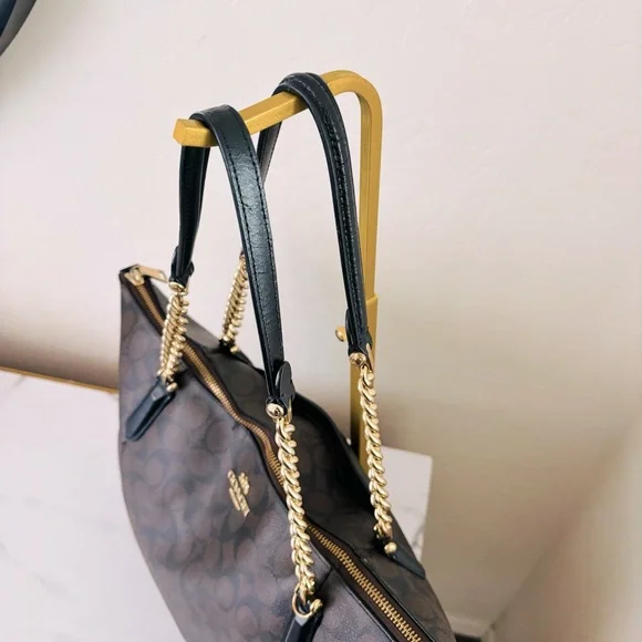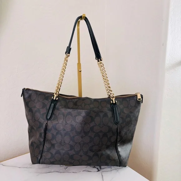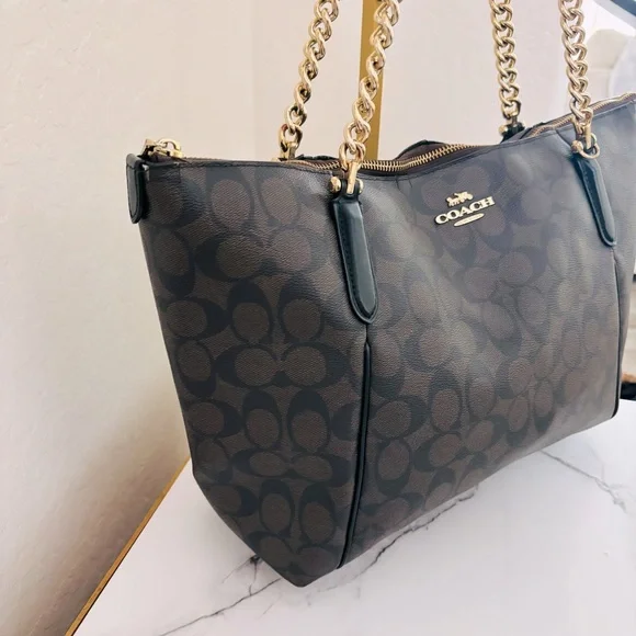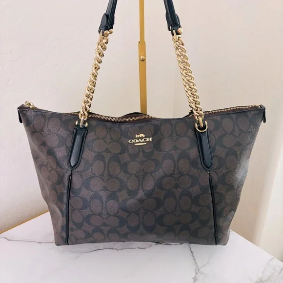 This Coach tote bag combines timeless elegance with modern flair, featuring a classic brown and gold color palette. The spacious interior and structured silhouette make it a versatile choice for any occasion, while the signature design adds a touch of sophistication.Coach Ava Chain Tote in Signature CanvasStyle 87776MSRP $499Year 2019Great used condition. Minimal signs of wear. Does not have a bag charm.