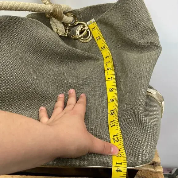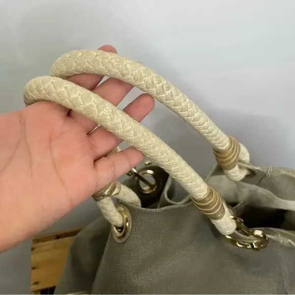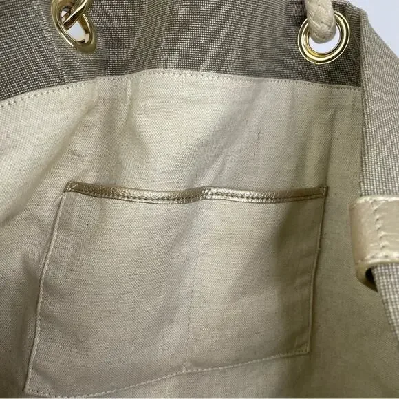 In great condition. Minimal spots from wear inside. Minimal wear to metalware. Anchor hook and rope handles. Coastal, beach bag, vacation, nautical, boating, minimalist, neutral, earth tone. Taupe color and beige interior.