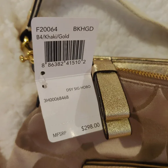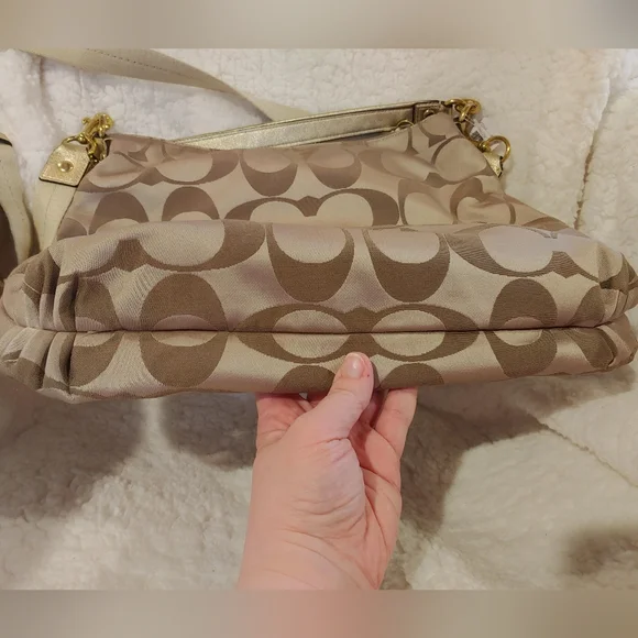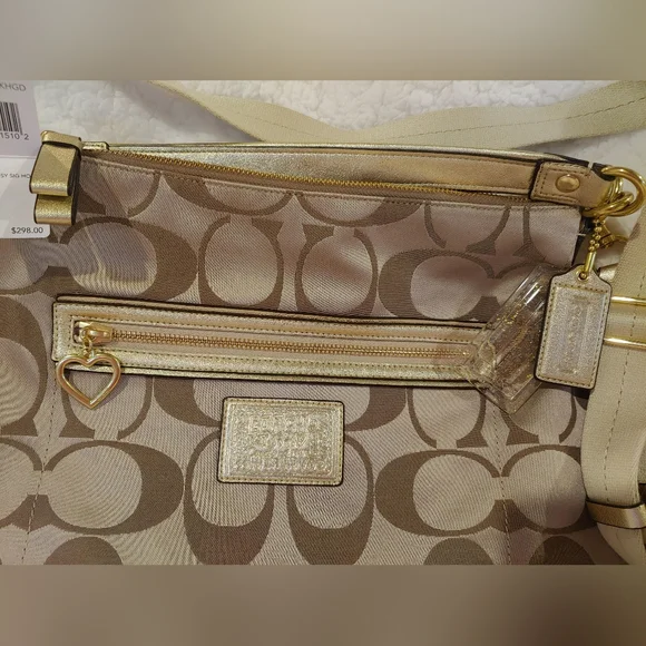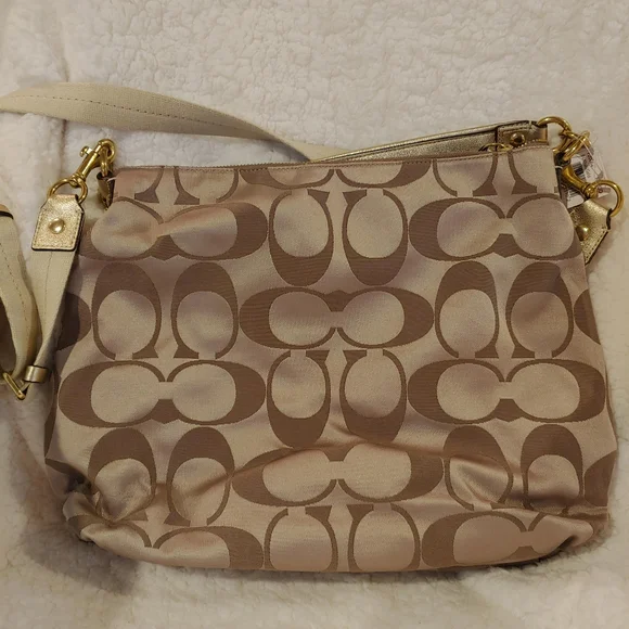 NWT Coach Daisy Signature Hobo Crossbody Bag in khaki and gold. Removable adjustable crossbody strap. Beautiful lavender liner!15"x12"x2"