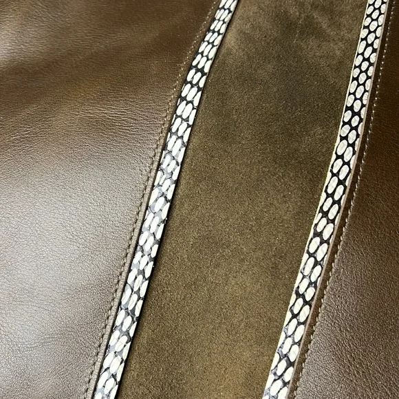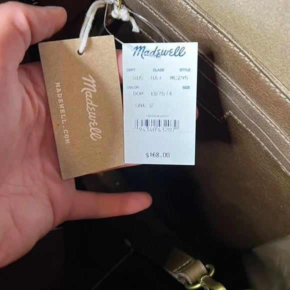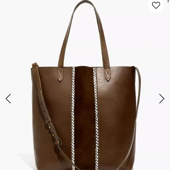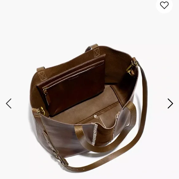 For sale a brand new with tags Madewell transport tote medium size in darkest olive. This has a suede inset. From Madewell: What goes into our Medium Transport Tote? Here it is by the numbers: 2 pieces of fine leather are used for the body. 1 sleek suede inset with snake-embossed piping. 2 ways to carry: with the top handles or the detachable shoulder strap. 1 exterior pocket for those things you gotta grab fast. 1 interior side zip pocket to keep your keys, phone and wallet at the ready. 24: the number of hours in a day that this bag looks cool. How often you´ll reach for it? 500 gazillion times.Styling tip: Customize it with one of our new bag straps (!).Leather, oiled suede.Do Well: Leather sourced from a tannery that achieved a Gold Rating from the Leather Working Group (LWG), an organization that works to promote sustainable environmental practices in the leather industry.8 1/4" handle drop.12 1/4"H x 11"W.Please let me know if you have any questions! Thanks for looking!