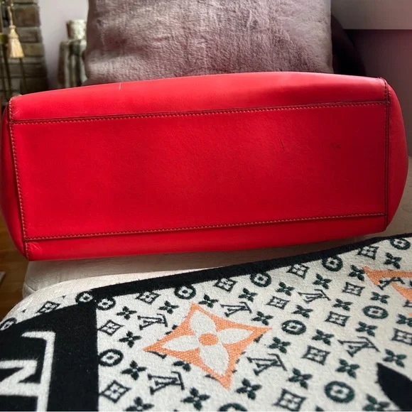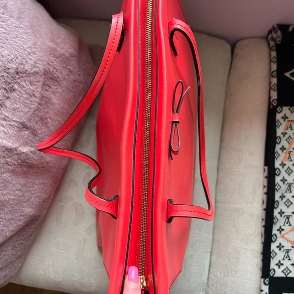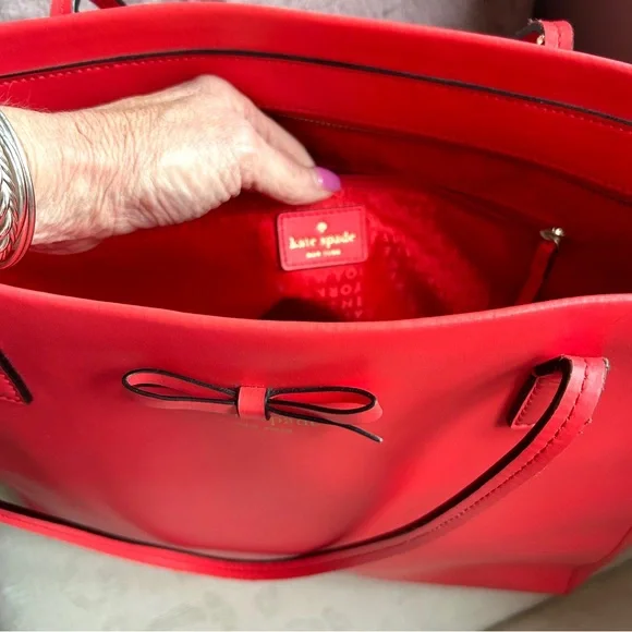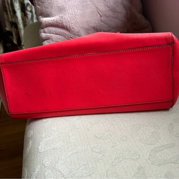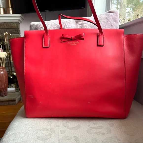 Kate Spade New York Geranium Taden Sawyer Street Large Leather ToteTimeless Large Leather Shell in a vivid color with a sweet little bow18.5W x 12.5 H x 6 D8.5 handle dropLeatherZip closureInterior 1 zip and 2 slip pocketsMinor scuffs as seen in pics