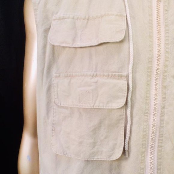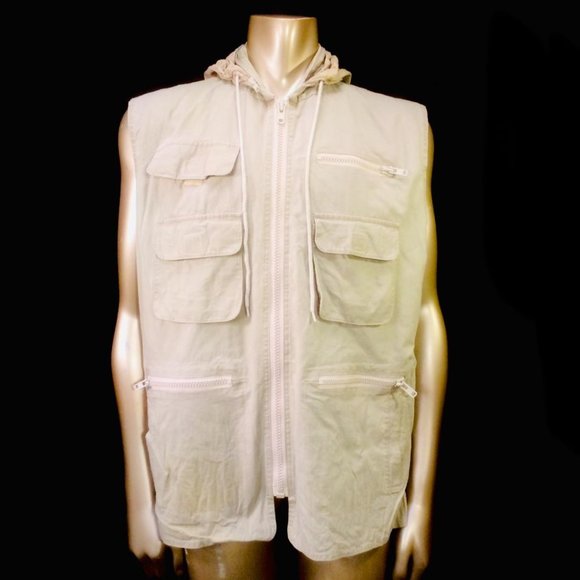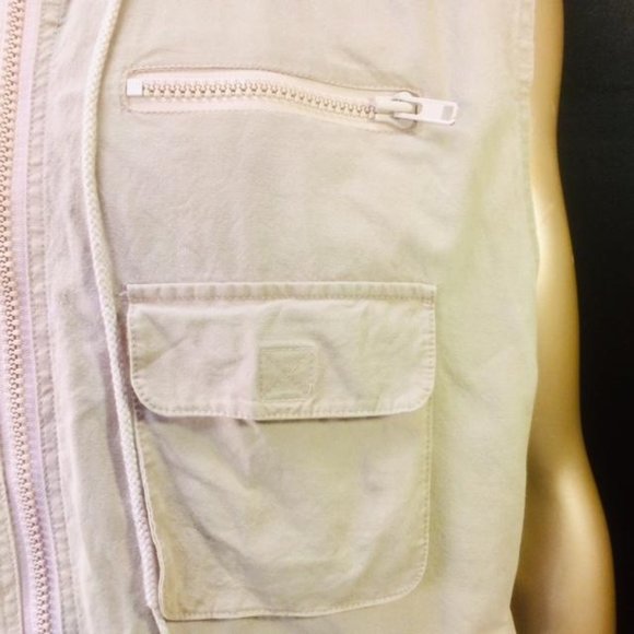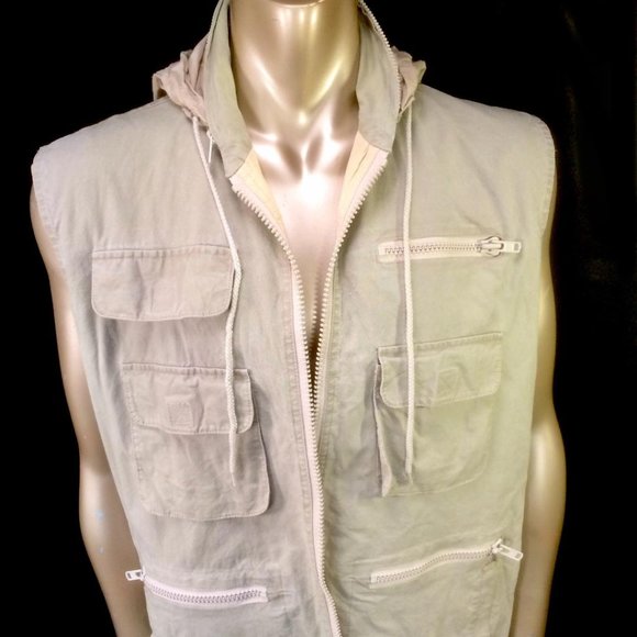 For sale is this vintage Banana Republickhaki safari photographer´s vest.Attached hoodie with drawstring, zip front,three zip front pockets, three front velcro pockets,two back flap pockets.Length 28"Armpit to armpit 25"Shoulders 20"