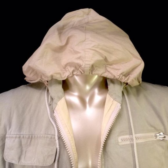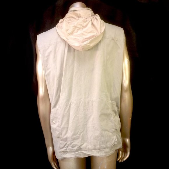 For sale is this vintage Banana Republickhaki safari photographer´s vest.Attached hoodie with drawstring, zip front,three zip front pockets, three front velcro pockets,two...