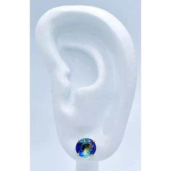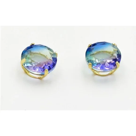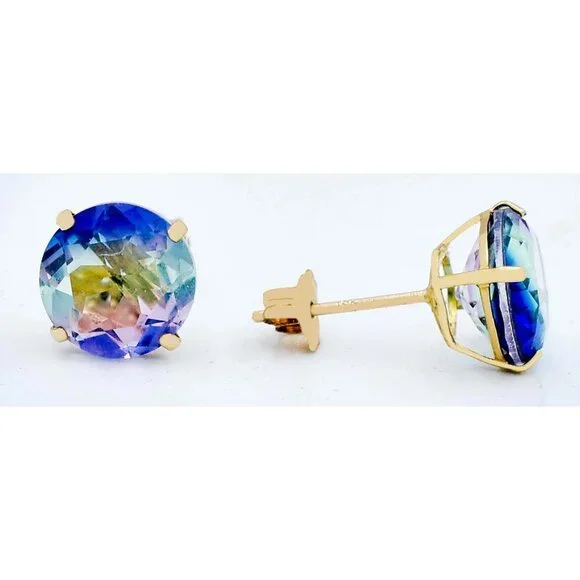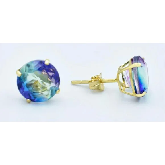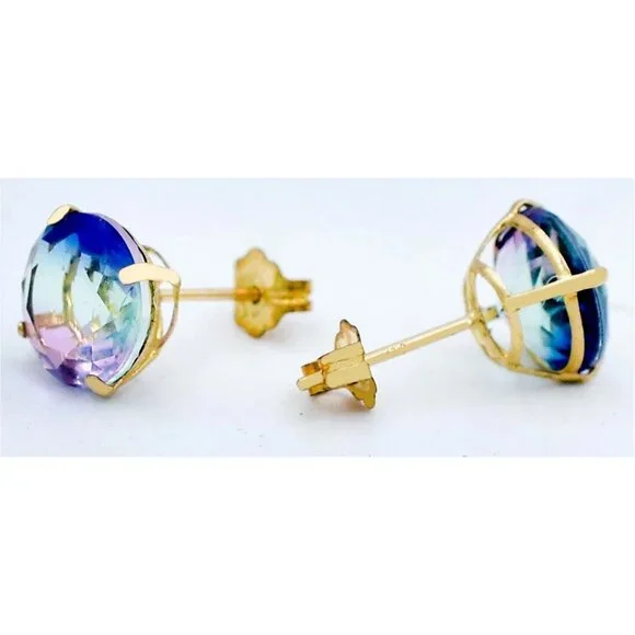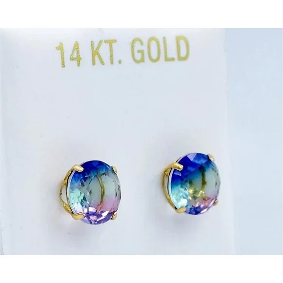 Metal Purity: 14k Yellow GoldCondition: New with tagGemstone Type:2 lab created TourmalinesTotal ct weight : 5.40 Tourmaline grades,Hue . . .Blue/green/purpleTone . . . medium darkSaturation . . . vividCut . . .very goodNo inclusions or flawsDimensions: 8 mm each gemstone measurementsAppraisal available for a low cost of $25.00 (request this service if you are interested)