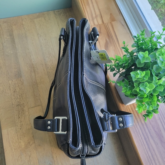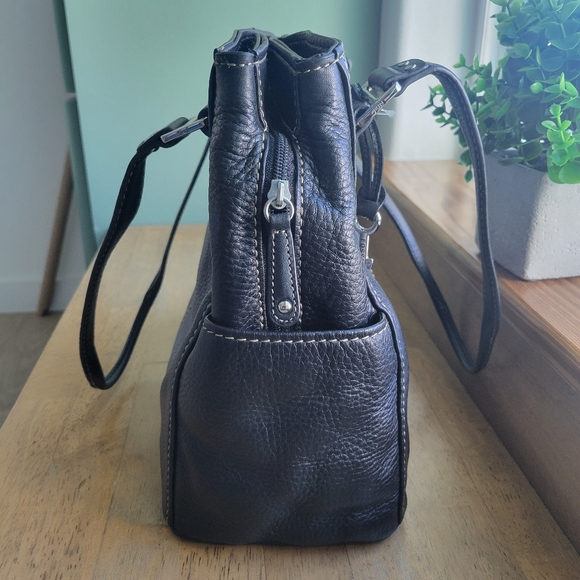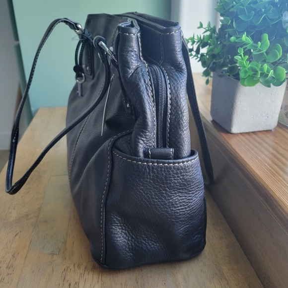 Soft pebbled black leatherSilver hardwareDouble handles 10"handle dropOne main zippered compartmentTwo magnetic closure compartmentsMeasures approximately 12.5" x 5.5" x 11"I...