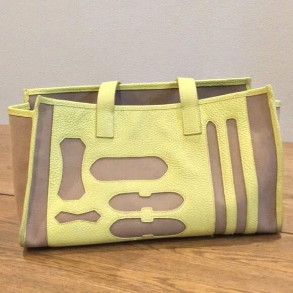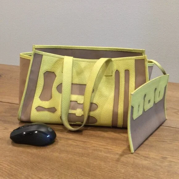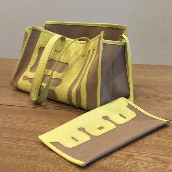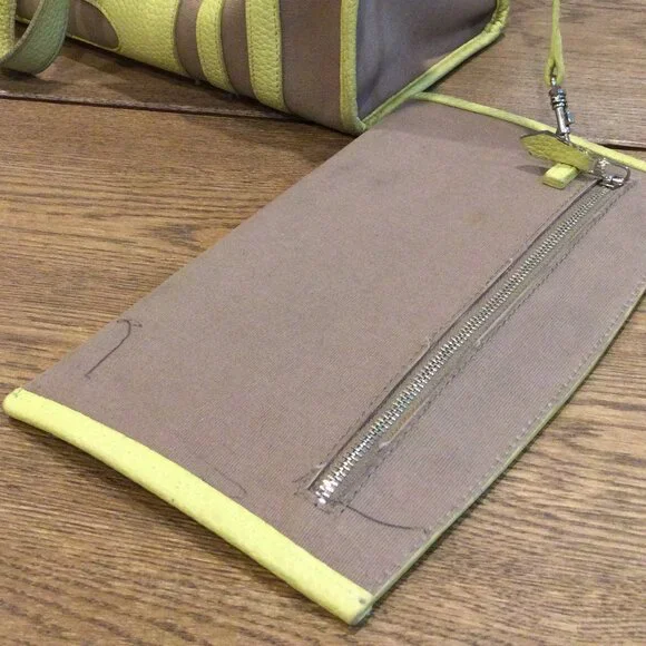 Light Brown canvas and yellow leather tote bag. There is a ballpoint pen mark.Straps have some wear.Made in Korea.