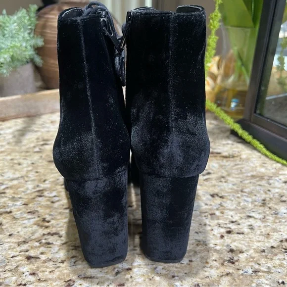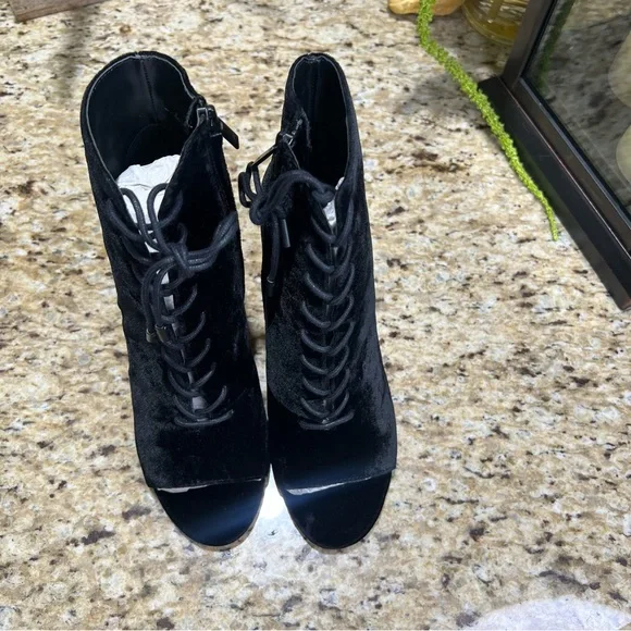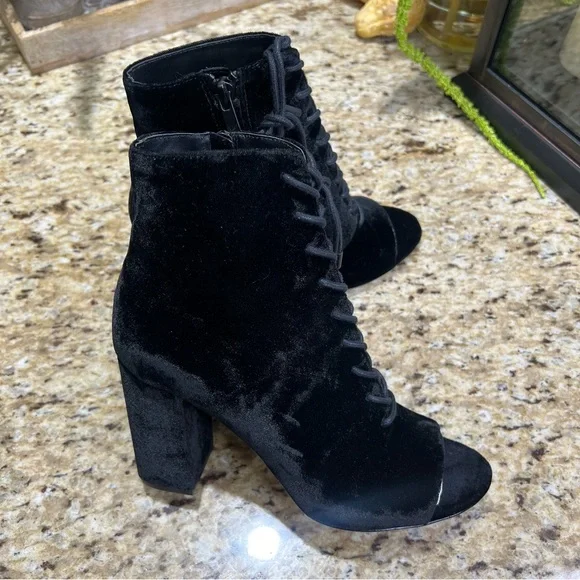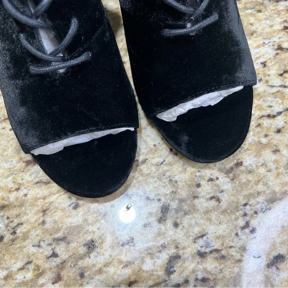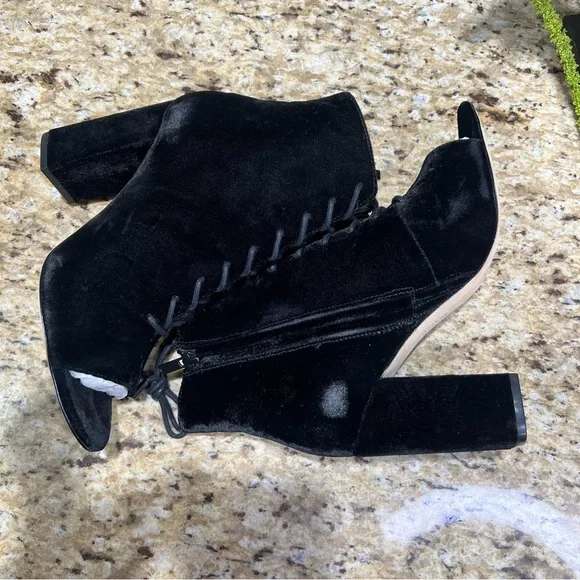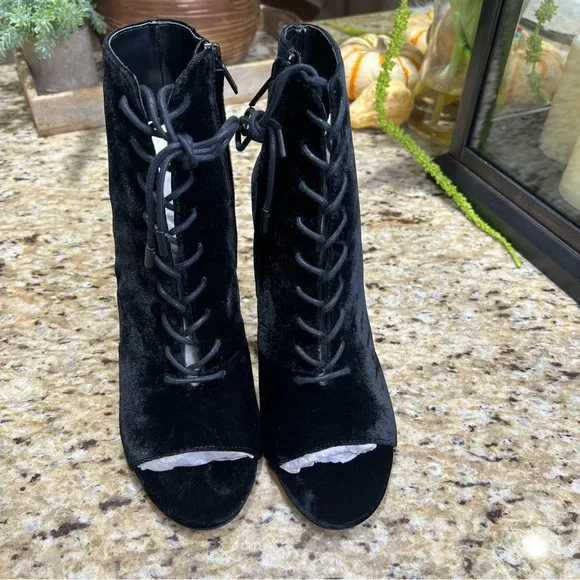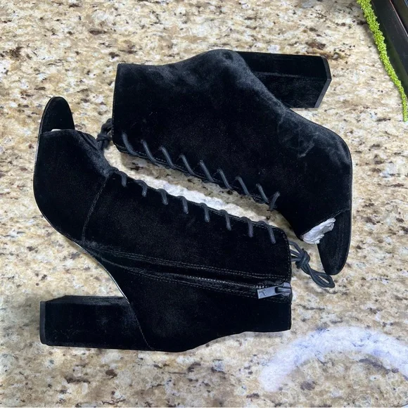 Joie Black Velvet Lakia Lace Up Block Heel Peep Toe Booties. Sz 39. NWOT. Never worn. Lace up front with zip inner side of boot. Approx 3.5” chunky heel wrapped in velvet. Shaft...