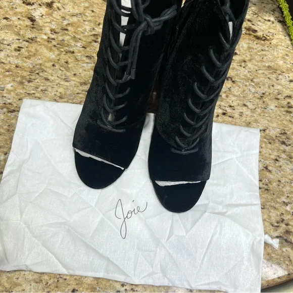 Joie Black Velvet Lakia Lace Up Block Heel Peep Toe Booties. Sz 39. NWOT. Never worn. Lace up front with zip inner side of boot. Approx 3.5” chunky heel wrapped in velvet. Shaft approx 4.5”. Leather lining and soles. Perfect fall/winter boot. Comes with original Joie dust bag.