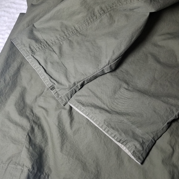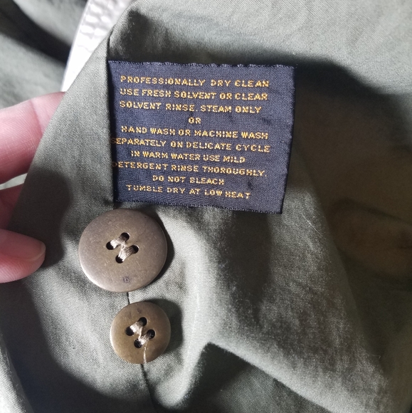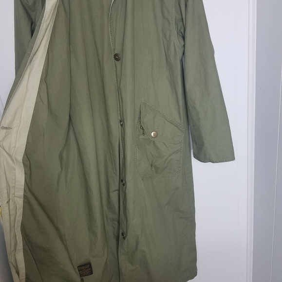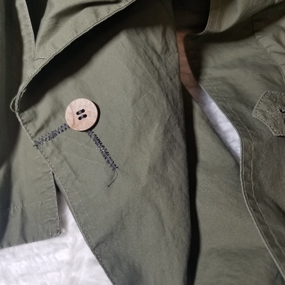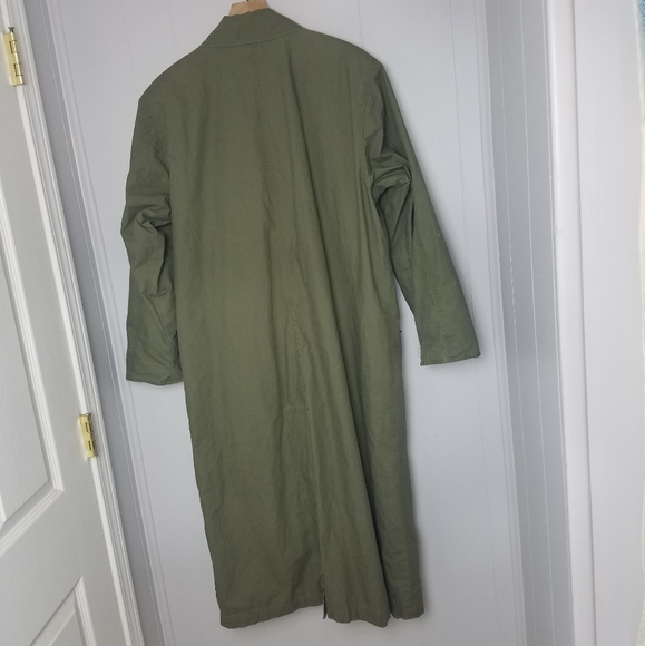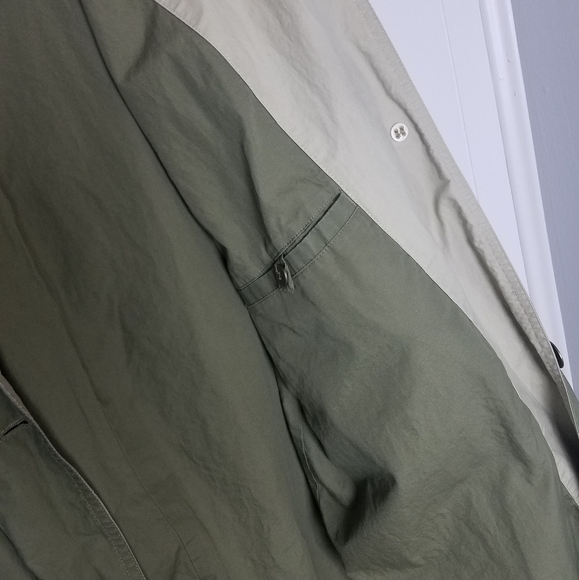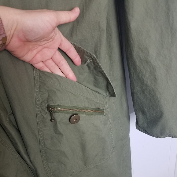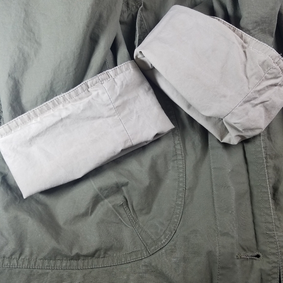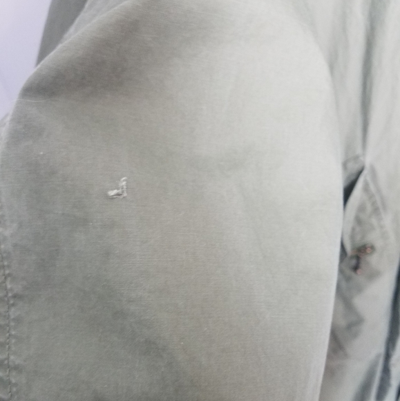 Good used condition jacket by Eddie Bauer.I love this oversized style.Has 4 outer pockets and 1 interior pocket.There is a small rip near the elbow of the right sleeve.You can tell this was worn with the sleeves mostly rolled up, as there are wear marks on them, and slight staining on the inner lighter fabric.The back flap button has been repaired.All shown in pictures.About 49" long from shoulder to hem.Lighter weight, and also has a bit of shoulder padding.bin#4.8