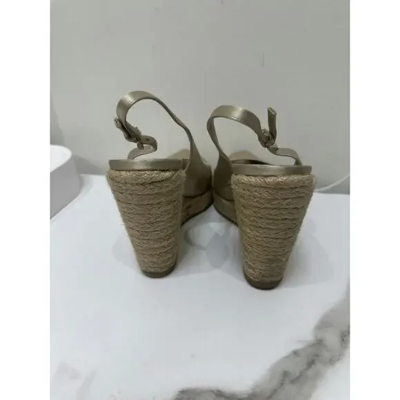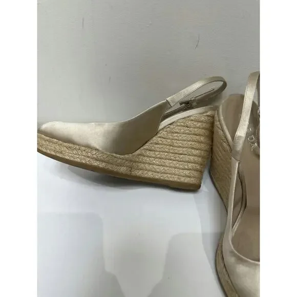 Brand: PradaSize: 39.5 (EU)Style: Satin Espadrille Wedge Slingback SandalsColor: Light BeigeMaterial: Satin upper, jute-wrapped wedge, and rubber outsoleCondition: Good (minor...