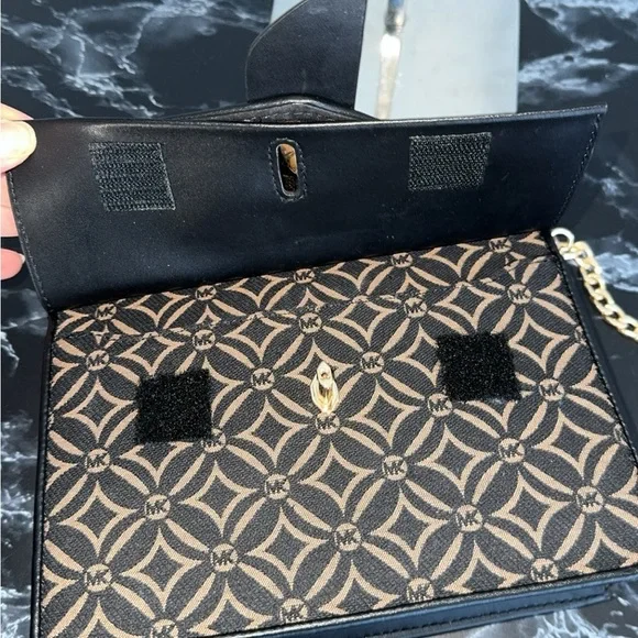100% AUTHENTIC PREOWNED Product DetailsColorblocked and finished with signature logo details, this Michael Michael Kors crossbody features an adjustable chain strap in a gleaming gold tone.Approximate measurements: 8 in W x 6 in H Gold tone exterior hardwareNOTE: This is an AUTHENTIC MK BAG. Previously owned. Original strap is missing and a gold tone chain was added. Turn lock closure is damaged. Velcro tape was added for closure. Refer to photos. Retail Price: $298#HB-F
