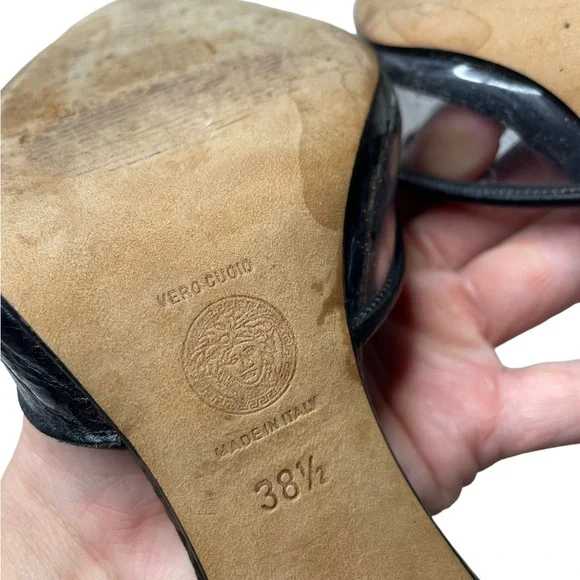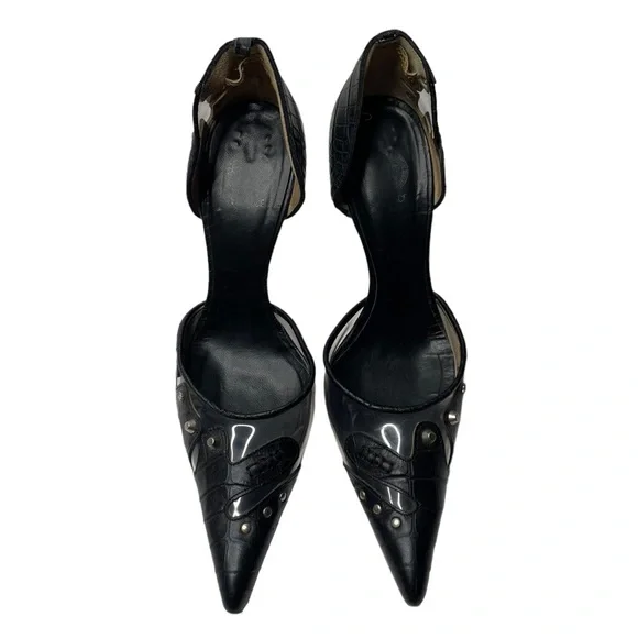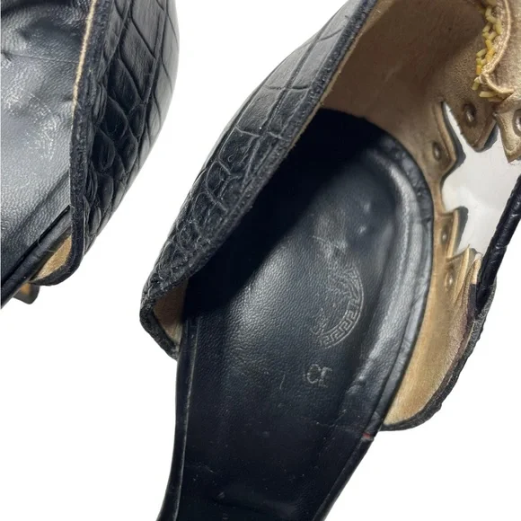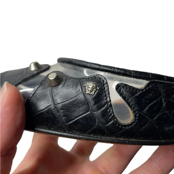 Croc embossed leatherPVC inlaysSilver studs with brand signature MedusaPointed toeSize: 38.5Color: BlackCondition: good vintage condition, light scuffing on inner PVC of right...