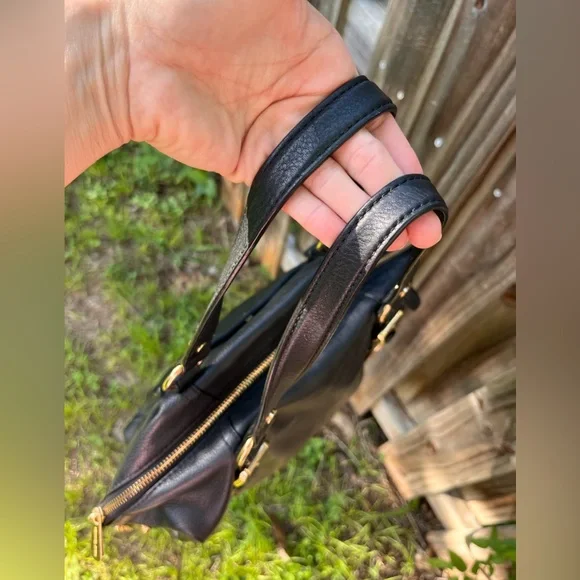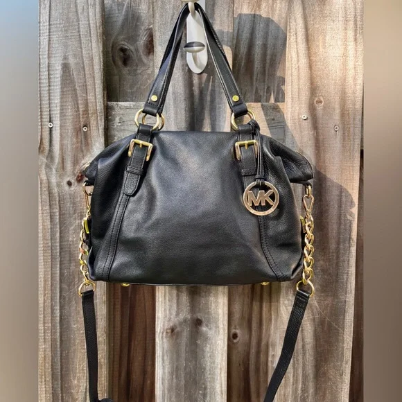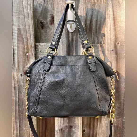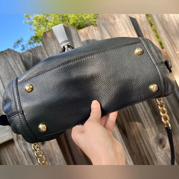MICHAEL Michael Kors MD Tristan Black leather Satchel with black fabric lining Top zip closeMetal feetRemovable, adjustable chain and leather shoulder strapRear slip pocket with snap close Gold toned hardware Approx 15”(at the top across)x10”x5”NWOT, immaculate.Considering it hasn’t been carried, I have it listed for less than half of what I paid, my price is more than fair.Cross posted Smoke free