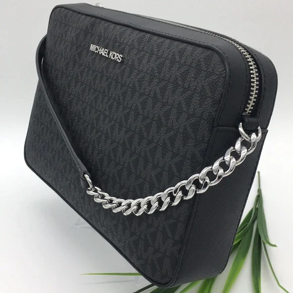 MK LG EW CROSSBODY black 35T8GTTC9L 100% Mandarin Leather /PVC with fold-tone hardware Measurements: 9.5"(L) X 6.5"(H) X 2.25"(D) Adjustable chain & leather strap with appx. 22"...
