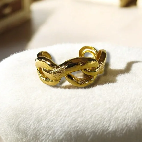 This exquisite Alexis Bittar ring features a graceful infinity design crafted in luxurious gold. The twisted pattern adds a touch of sophistication, making it a standout piece in any jewelry collection. Its warm, yellow-gold hue and intricate detailing offer a timeless elegance.