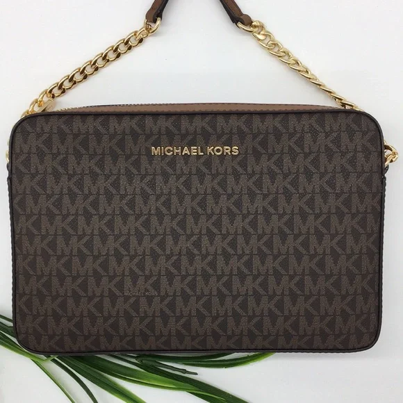 MICHAEL KORS LG EW CROSSBODY Bag Brown. 35F 8GTTC3B. Brand New with tag 100% Authentic Brown Leather /PVC with gold-tone hardware Measurements: 9.5"(L) X 6.5"(H) X 2.25"(D) Adjustable chain & leather strap with appx. 22" drop •Top zip closure •Interior 1 large padded pocket & 1 slip pocket MK logo lettering on front & interior MK signature fabric lining.