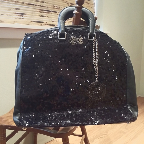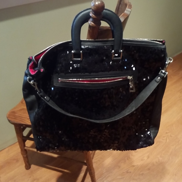 Secret Pom Pom Black Sequin Satchel Black sequinLeather Front and back sequinsBottom and sides leatherFeet on bottom1 inside zip pocket1 outside zip pocketZipper topHot pink lining Silver metal purse charm2 handles with 2" dropDetachable shoulder strap 5" drop16" length 14" width 4.5" depthMade in Italy New condition