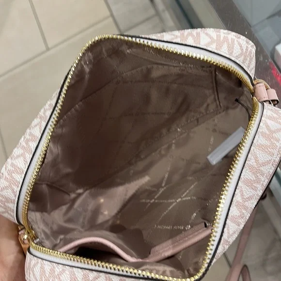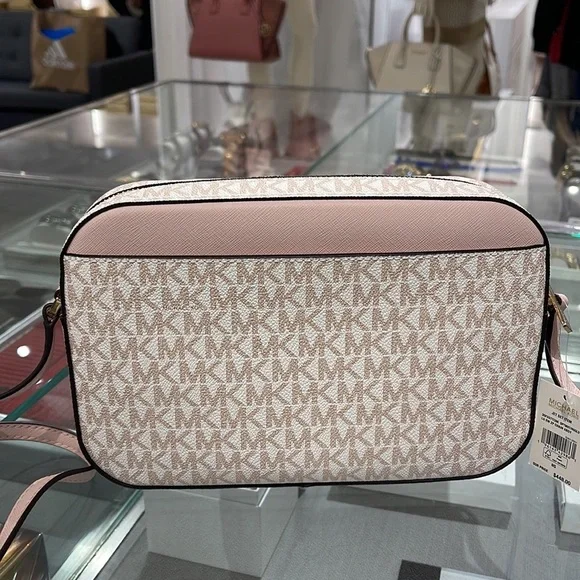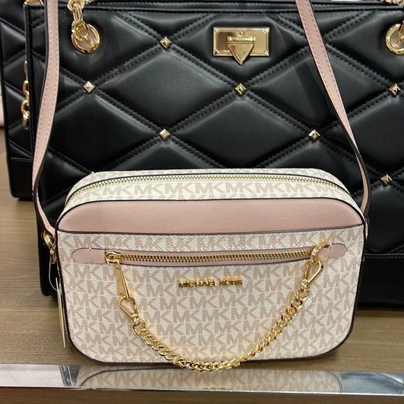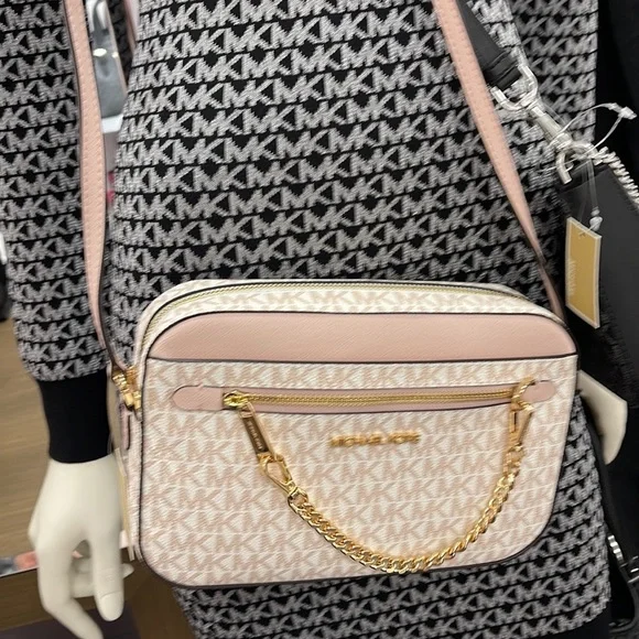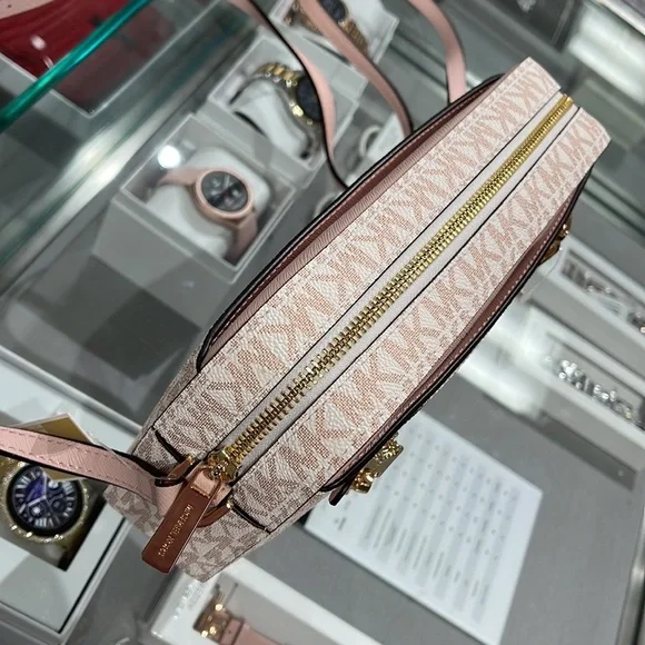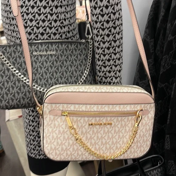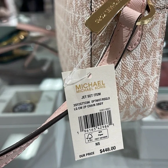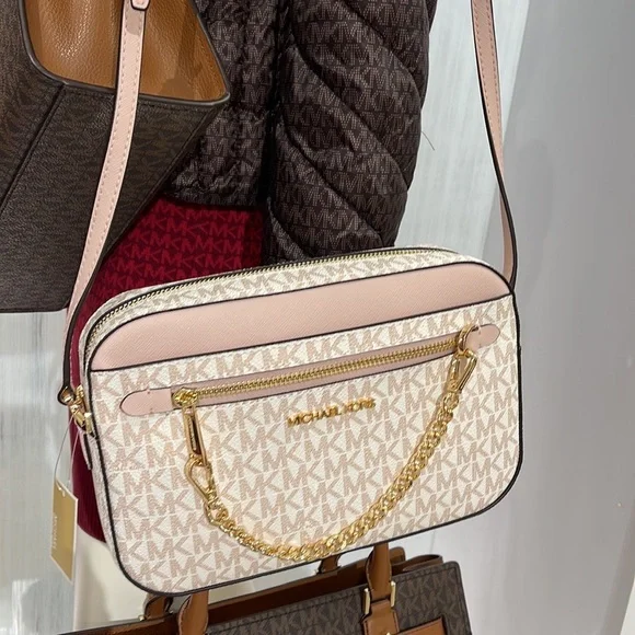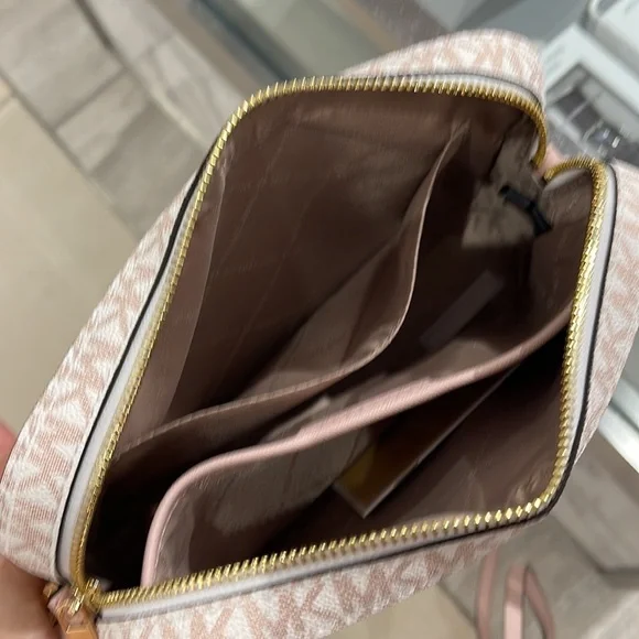 Michael Kors Jet Set Item Large East West Zip Chain Crossbody Optic White/Rose Gold Color: Optic White/Rose Gold Signature • Crossbody bag • Logo-print canvas • 89.4% coated canvas/9.6% polyester/1% polyurethane • Gold-tone hardware • 9.5”W X 6.5”H X 2”D • Exterior details: detachable crossbody strap, back slip pocket, front slip and zip pockets • Interior details: back and front slip pockets • Lining: 100% polyester • Zip fastening • Dust bag not includedBrand New with tag