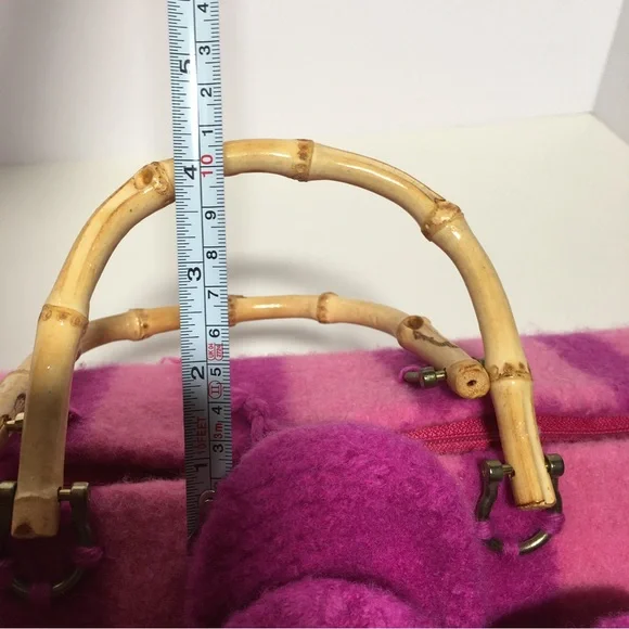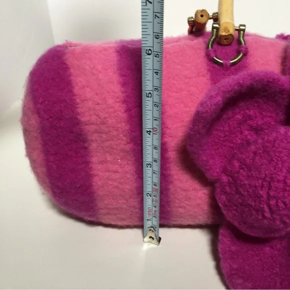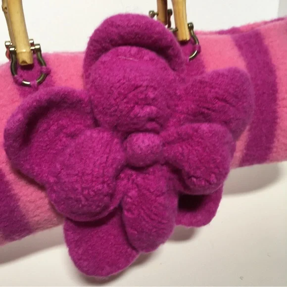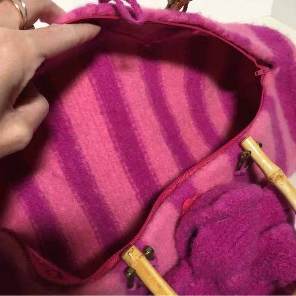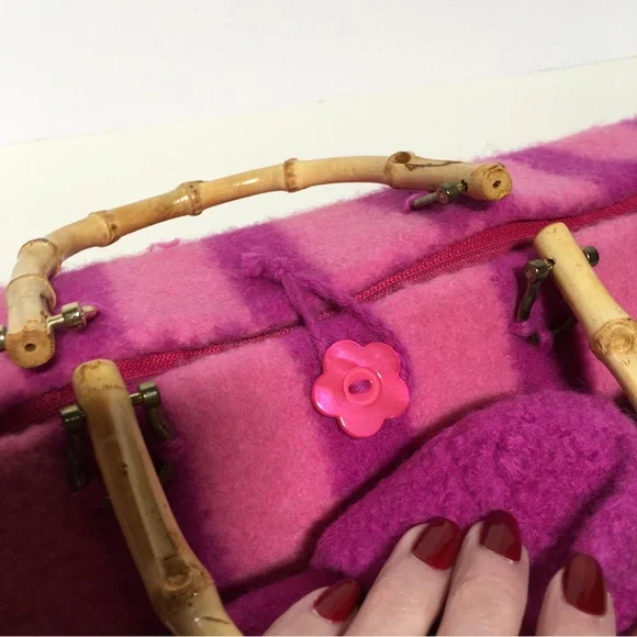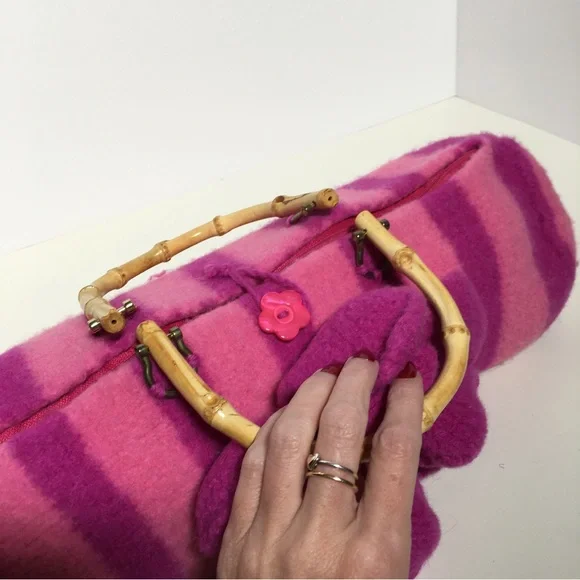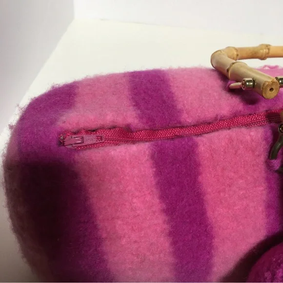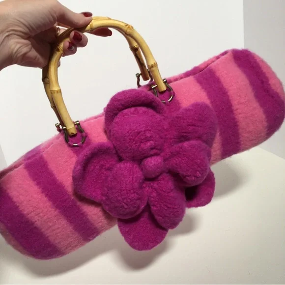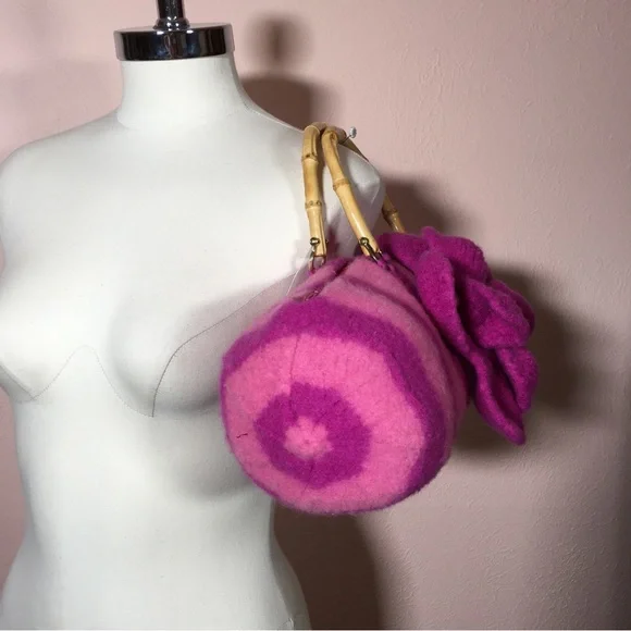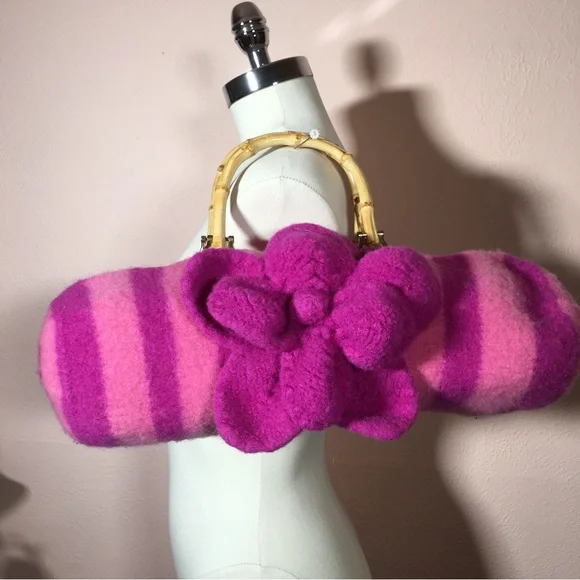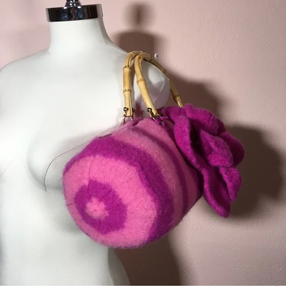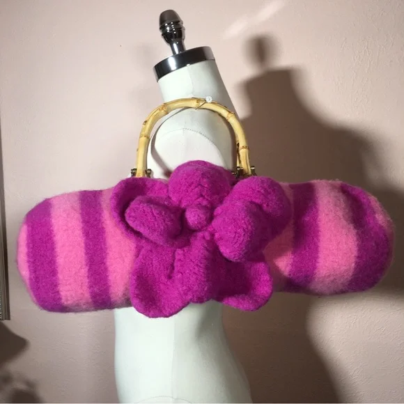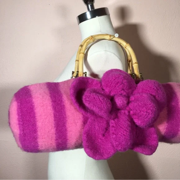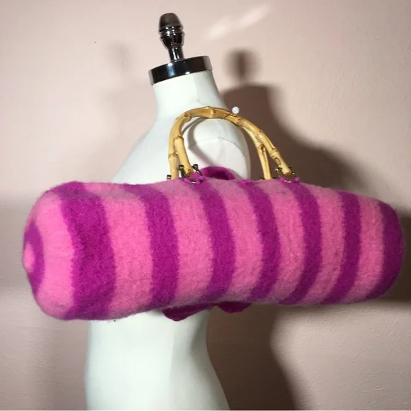 Vintage 90 Y2K Barbiecore Pink Wool Knitted Felted Baguette Bag Handcrafted Come on barbie let’s go party!! This sweet Cottagecore bag is handmade with a wool felting technique, top zipper, and bamboo handles. Bright Barbie pink and Barbie plastic magenta stripes in a long baguette shape. Large felted flower is detachable if desired. Excellent handmade condition Size approximately 16 by 6 by 6Need More Specifics? Just Ask ❤️ I am Happy to Help Offers Welcome ❤️