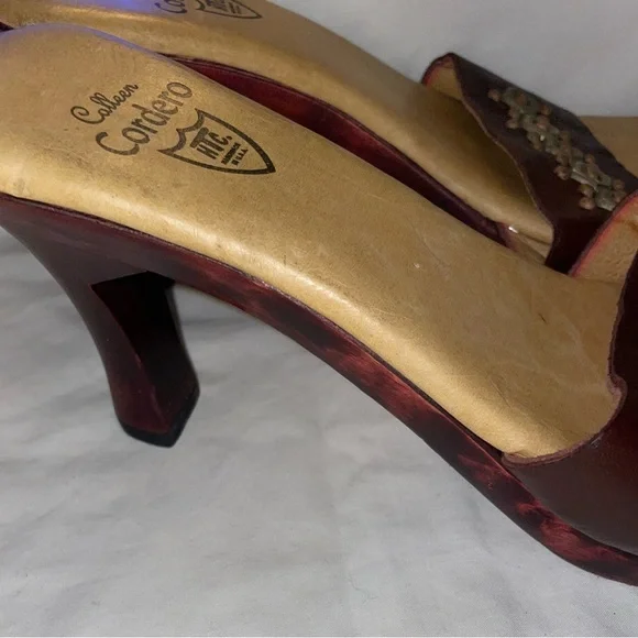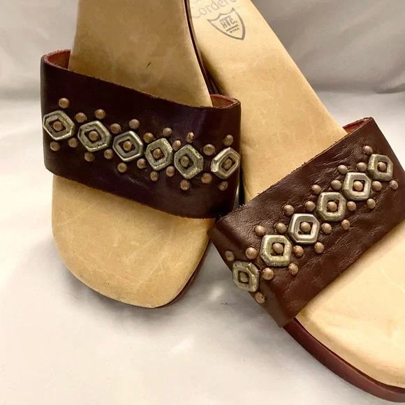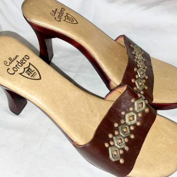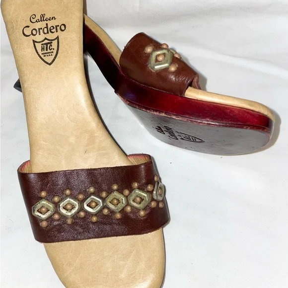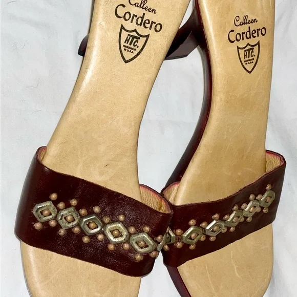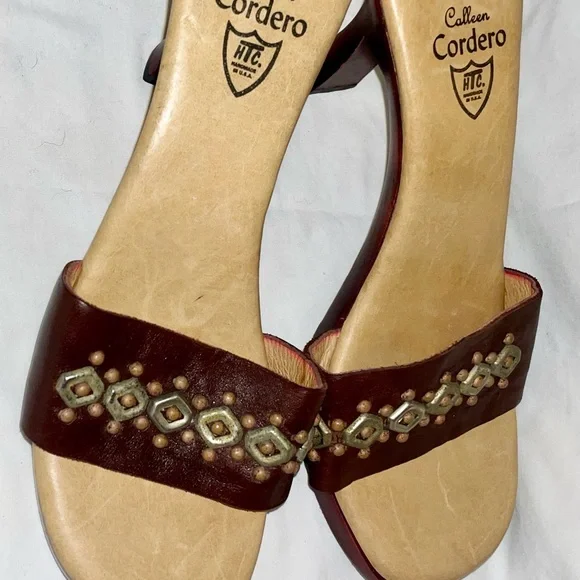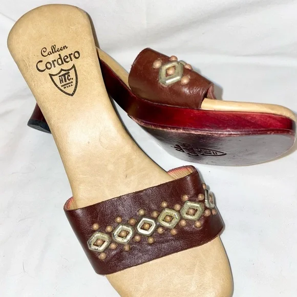 Calleen Cordero Leather With Brass Detail Wood Heel Slide Sandal Shoe Size 9 New