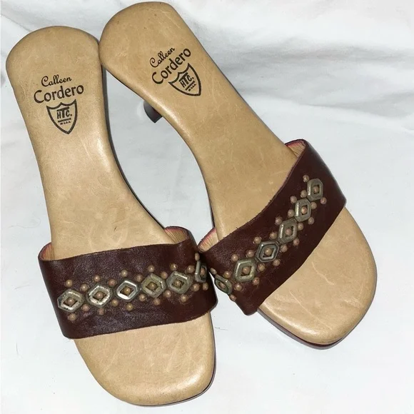 Elevate your style with these beautiful Calleen Cordero leather slide sandals. Crafted with a unique brass wood heel, these sandals are perfect for any occasion, whether it´s a casual day out or a fancy party. The studded accents add a touch of edginess to these sandals, making them stand out from the rest.Comfort is not compromised with these limited edition sandals, as they come with cushioned and non-slip features. Available in size 7 UK and 9 US, these brown leather sandals are perfect for the spring, summer, and fall seasons. Made in the United States, these sandals are a must-have for any fashion-forward woman who wants to make a statement.US Size 9 New without Box MADE IN USA