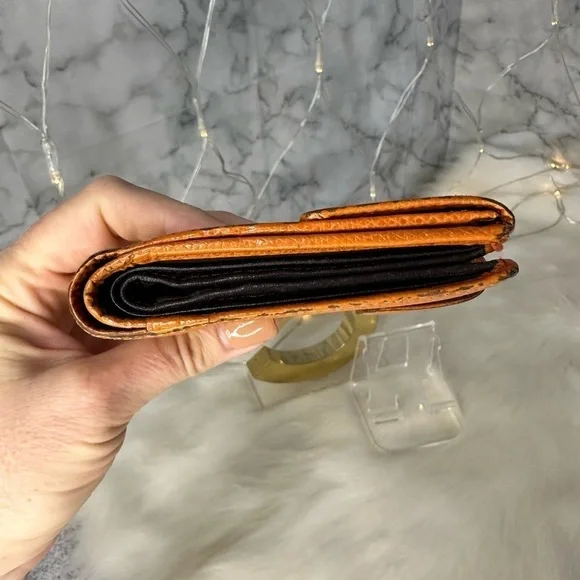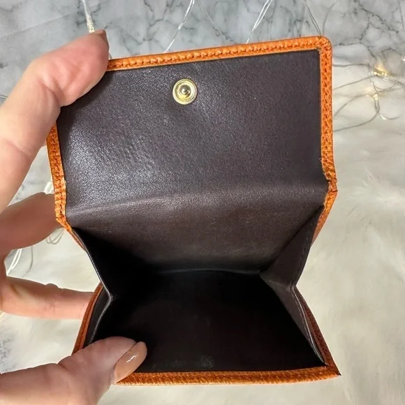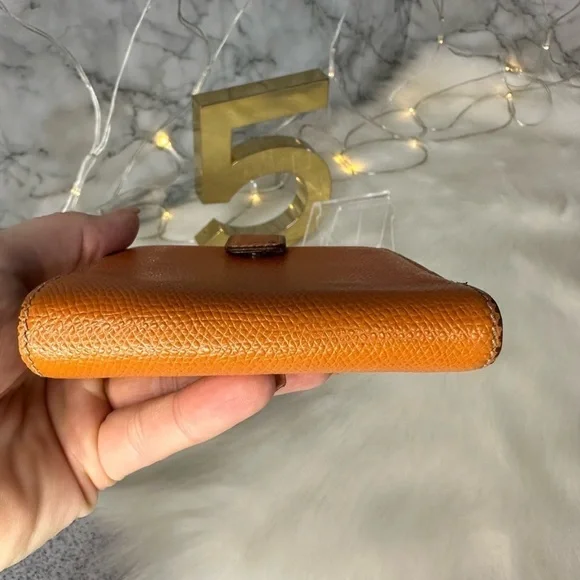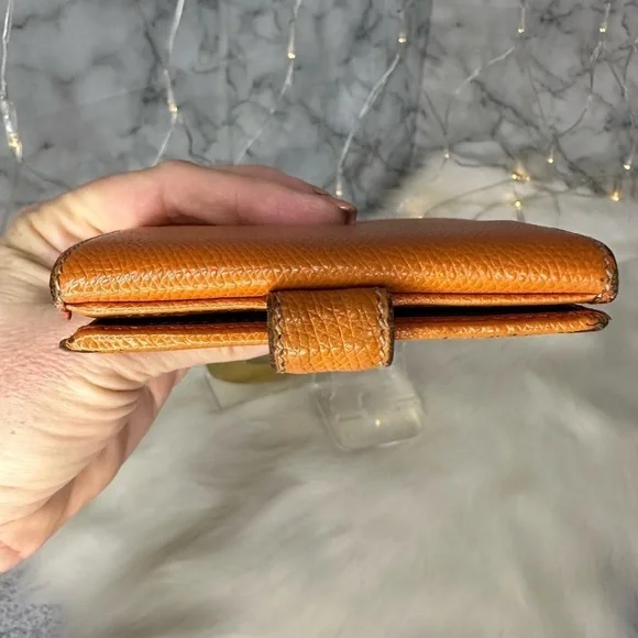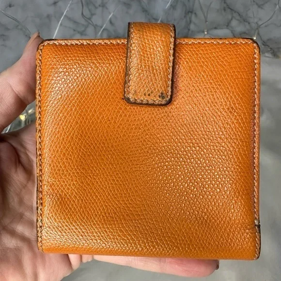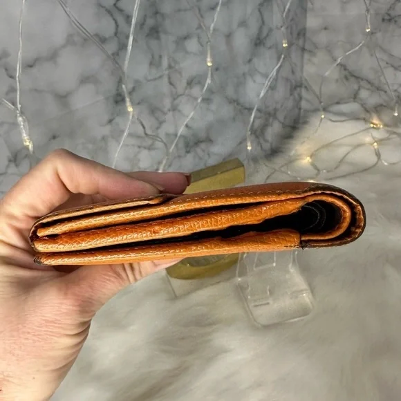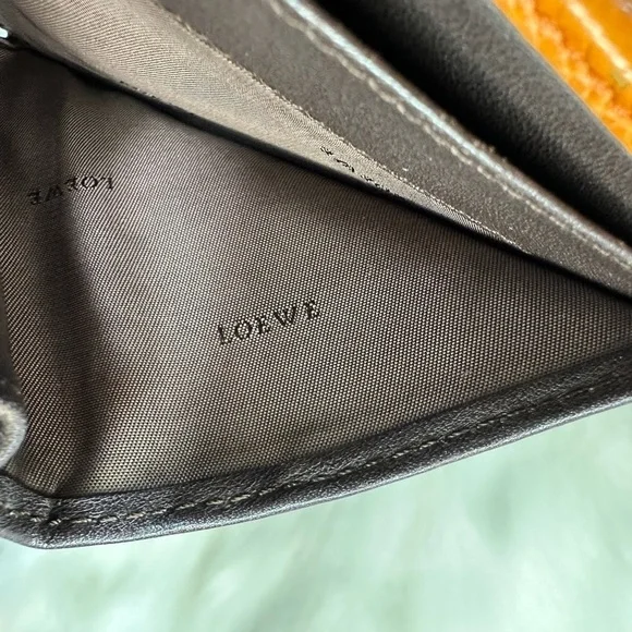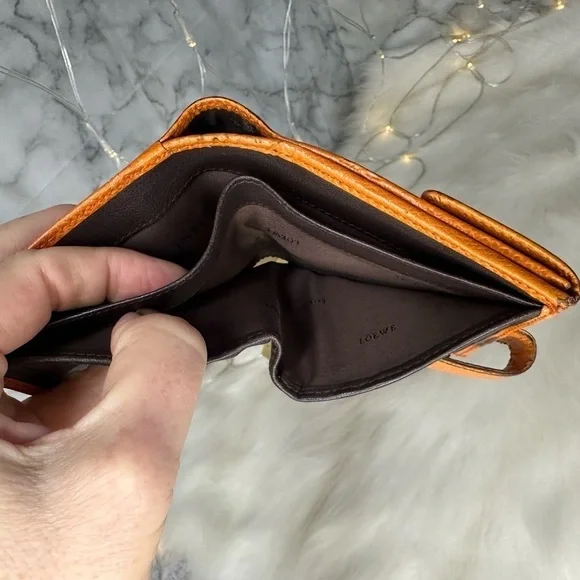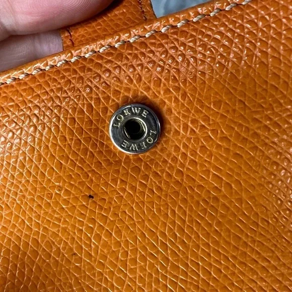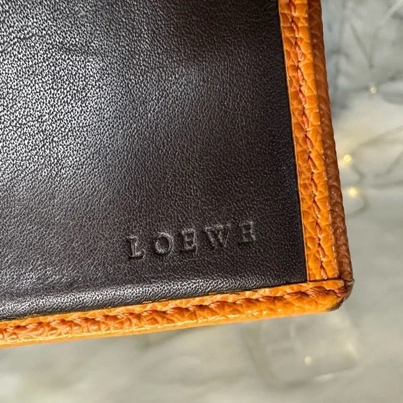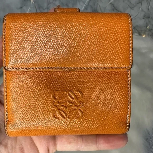 AUTHENTIC LOEWE ORANGE ANAGRAM LEATHER BIFOLD SNAP WALLETWallet has stains and scratches throughout but is in great condition.Leather is rubbed on corners and edges.See photos. Size is 4.3”x3.9”.Has 7 credit card slots,a dual bill compartment, and a separate coin compartment snap closure.