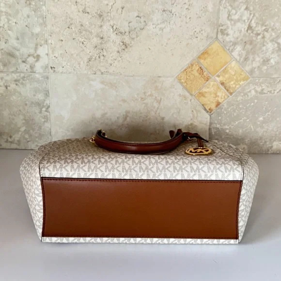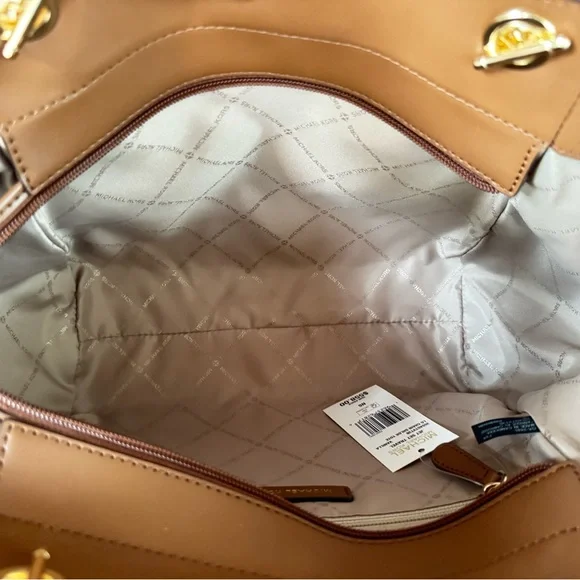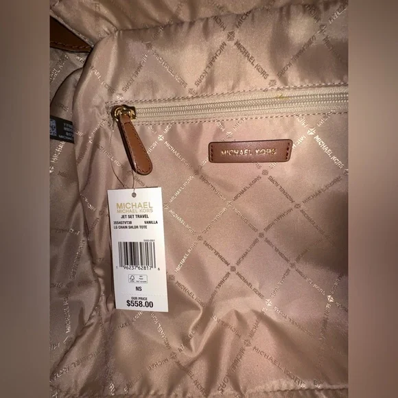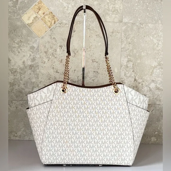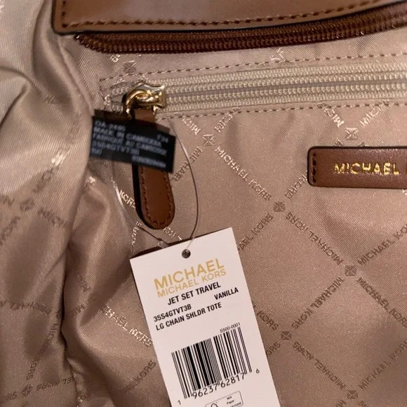 NEW WITH TAGMICHAEL KORS JET SET TRAVEL LARGE SHOULDER CHAIN TOTE BAGPVC LEATHER MK SIGNATUREVANILLA100% AUTHENTIC RETAIL: $558.00 Plus TaxThe Tag said Large but the bag is medium to large.*PLEASE SEE THE MEASUREMENT FOR THE SIZE*!!NO DUST BAG!!MICHAEL KORS LOGO AT FRONTGOLD TONED HARDWAREZIP TOP CLOSURESLIP-IN SIDE POCKETS ON BOTH SIDE CUSTOM FABRIC LINING1ZIPPED POCKET14"(TOP) 11"(BOTTOM) (L)X 9"(H) X 4"(D) STRAPS: 10" VERY CLEAN, SMOKE-FREE AND PET-FREE ENVIRONMENT.