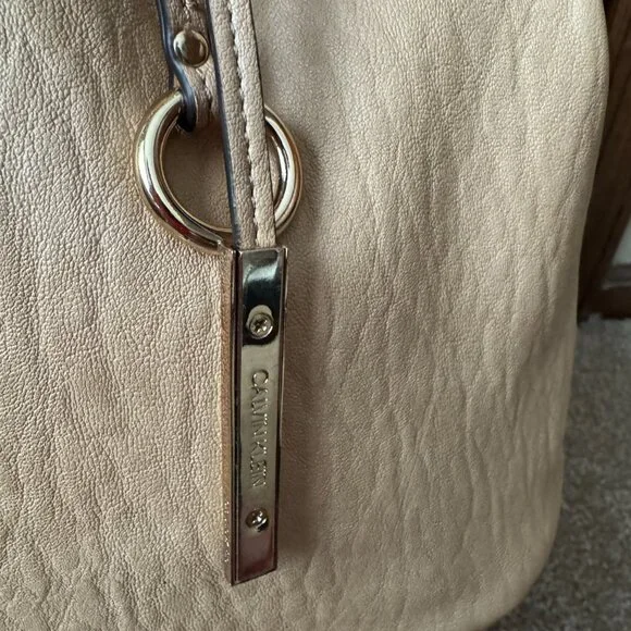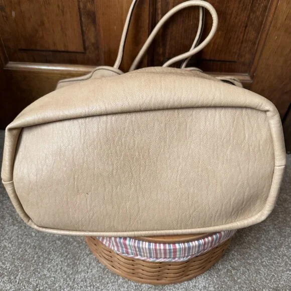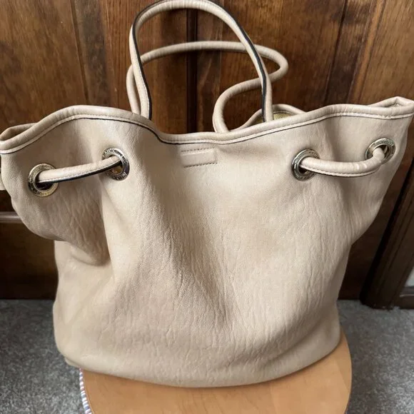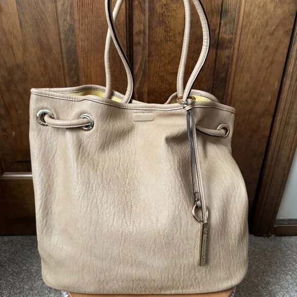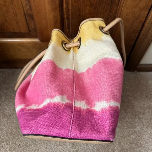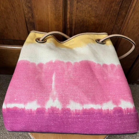 ; Tote Bag; Reversible; Likely Faux Leather - No Fabric Tags Attached; Side (1) Yellow, Ivory, Pink & Fuchsia Stripes; Tan Faux Leather Trim & Bottom; Faux Leather Tan Double Handles w/12" Drop; Hidden Magnetic Close; Handles Pull Bag Closed; Goldtone Logo Grommets & Logo Letters; Tan Faux Leather Double Hangtag with Goldtone Circles & Logo Bar; Side (2) Tan Faux Leather; Open Interior; Front: Logo Stencil; Bottom: 13"L x 6.5"H; Bag: 14"L x 6.5"Wx 13"H