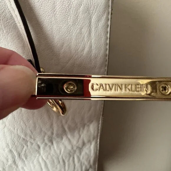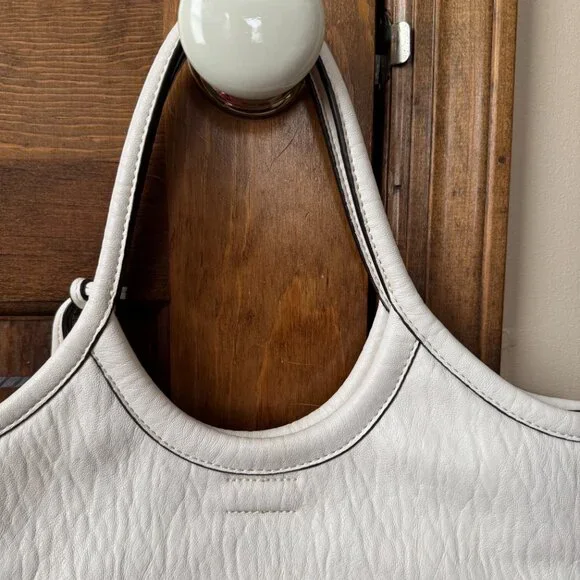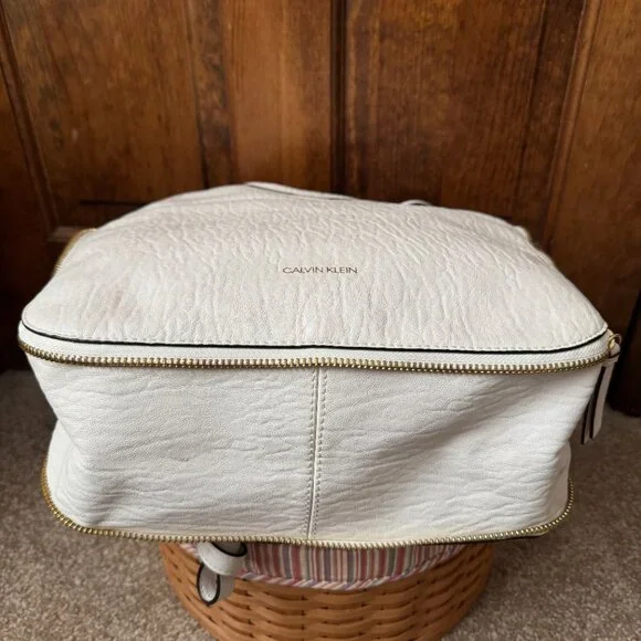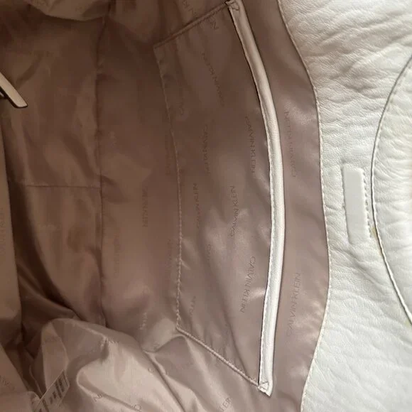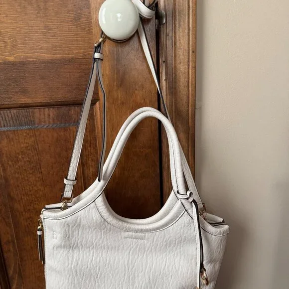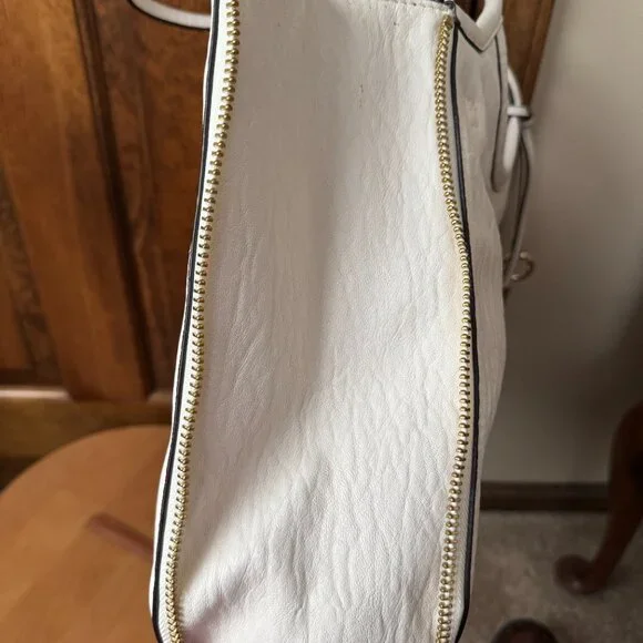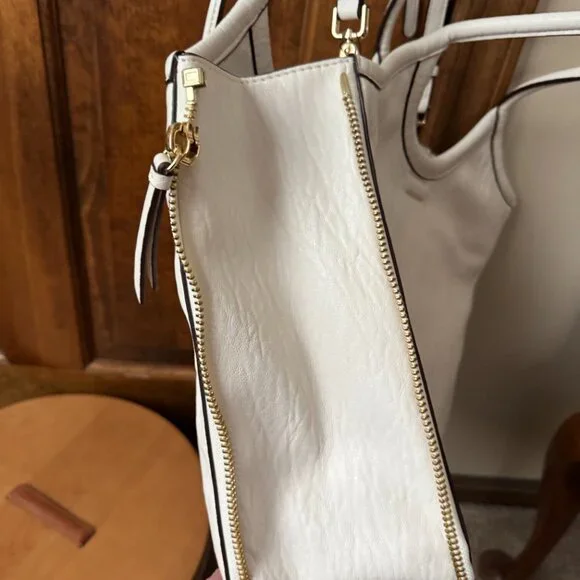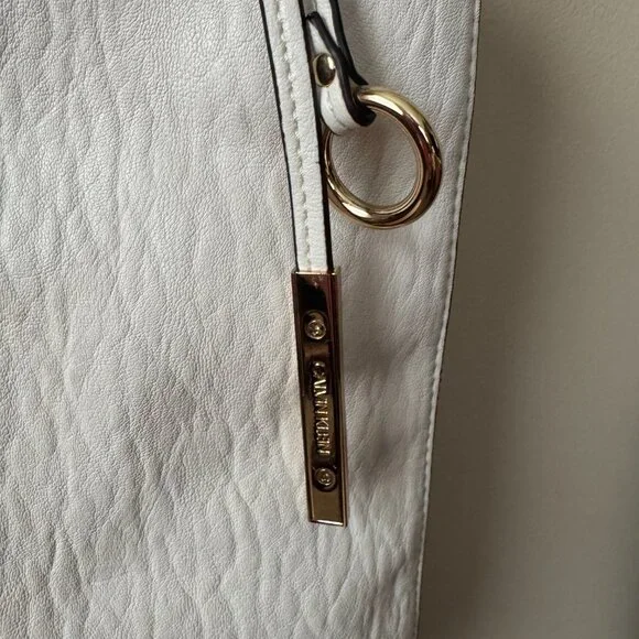 ; Tote; White; Faux Leather; Gabrianna; Expandable; Hidden Magnetic Close; Front: Logo in Gold Stencil; Zip Around Converts to Large Tote; Hidden Removeable Shoulder Strap;...