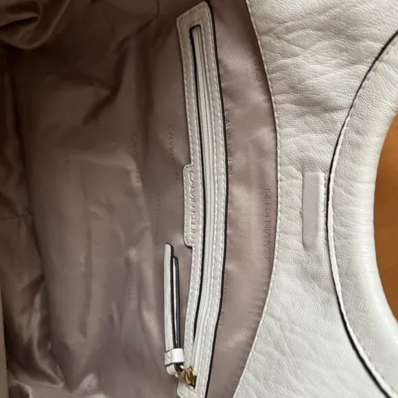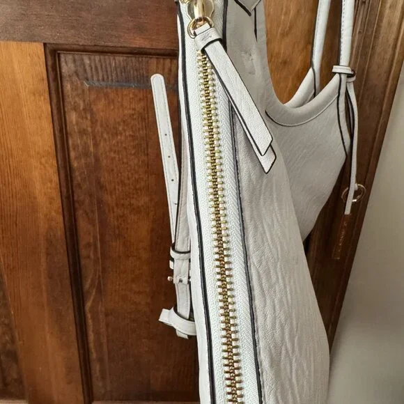; Tote; White; Faux Leather; Gabrianna; Expandable; Hidden Magnetic Close; Front: Logo in Gold Stencil; Zip Around Converts to Large Tote; Hidden Removeable Shoulder Strap; Goldtone Logo Hardware; Double Hang Tag w/Goldtone Circle & Logo Bar; Logo Fabric Lining; Back Interior Wall: Zipper Close Pocket w/Faux Leather Trim, Zipper Pull & Logo Patch; Front Interior Wall: Slip Pocket w/Faux Leather Trim; 12"L x 5"W (when unzipped) x 12"H; Handle Drop: 8"; Strap 22" Drop - Adjustable +/- 2"; 100% Man Made Material