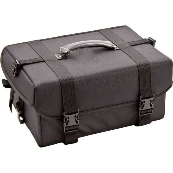 Black Soft-Sided Travel Makeup CaseProfessional Organizer with Extendable TraysSoft-sided makeup case made with heavy duty 1680d black nylon finishOpens with clasp to reveal 4 padded trays and a large center storage compartmentDetachable 13pcs. brush holder neatly lines beneath the lidsTray section is completely removable for easy mobilityTwo side snaps for extra securityExtra clasp attachments on the side for future customization and expansionRemovable shoulder strap is an added convenienceTrays dimensions: 10.25" x 6.5" x 1"Large center compartment dimensions: 13.5" x 10.25" x 3.75"Overall case dimensions: 16" x 11.75" x 8"