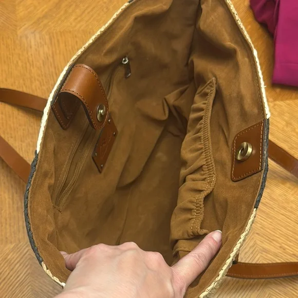 Patricia Nash Tinella straw tote bagFrom the woven collectionCream, tan and navy woven strawBrown leather front pocket and handlesInternal zip pocket and slip pocketsShoulder strapsIncludes storage bagNew with tags