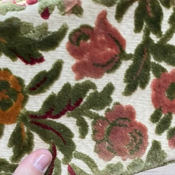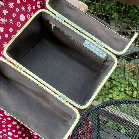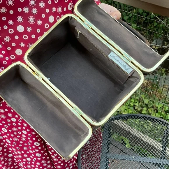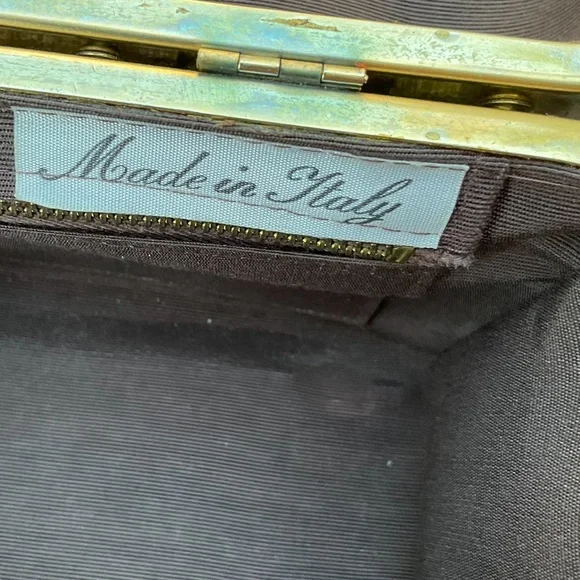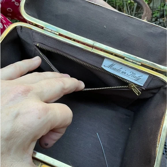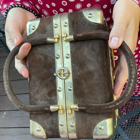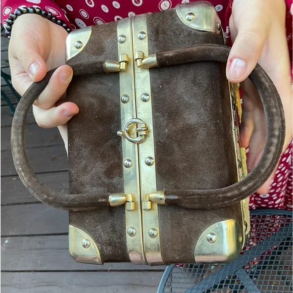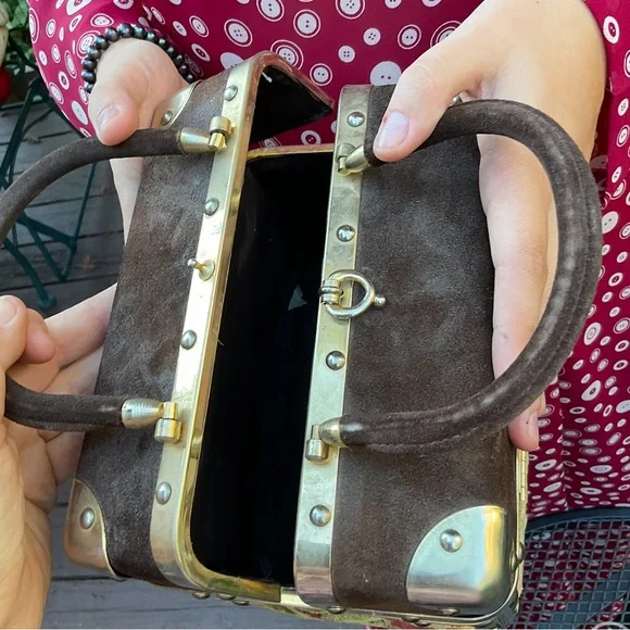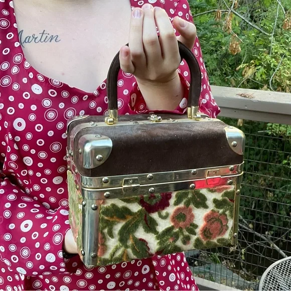 Stay tuned, coming soon!Beautiful quality vintage box purse bag. Has gold or brass metal joints. Top section of bag is a brown microfiber material. All other sides are a floral raised velvet like brocade with a tapestry appearance. Has 2 brown hard curved handels. Has small inside zipper pocket. Inside and only tag says, Made in Italy. Has gold brass reinforced seams and corners. Closure is on top and snaps. See photo. It is very strong and secure. Hold bag in hand or over elbow. This bag is not heavy and is a statement piece. Wear it with cream, brown, beige tan, rose or green. Looks great with a sports jacket. SizeL 8”W 5.5”H 6.5”Handel height from top of nag to top of arched handles. Condition is excellent vintage condition,photos shows exact appearance. No fading, discoloration, tears, snags or loose hardware. Can be easily maintained using a moist cloth. We love offers. Tags:tapestry floral gold Italy italian vintage 50’s 60’s velvet brocade