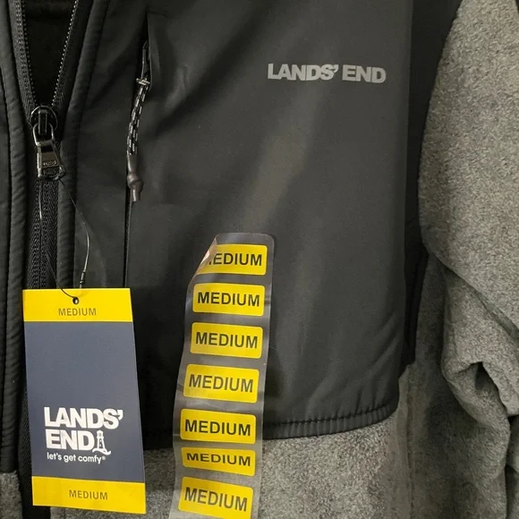 Lands End Men’s Size M jacket. Black and Gray. NWT. Fleecelined. Lightweight. Zip front. Front and side pockets. Windbreaker slick top in the black color, fleece in the gray color.