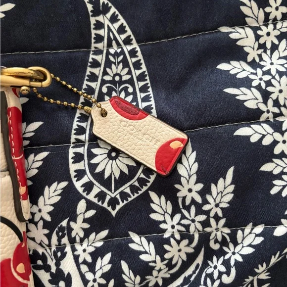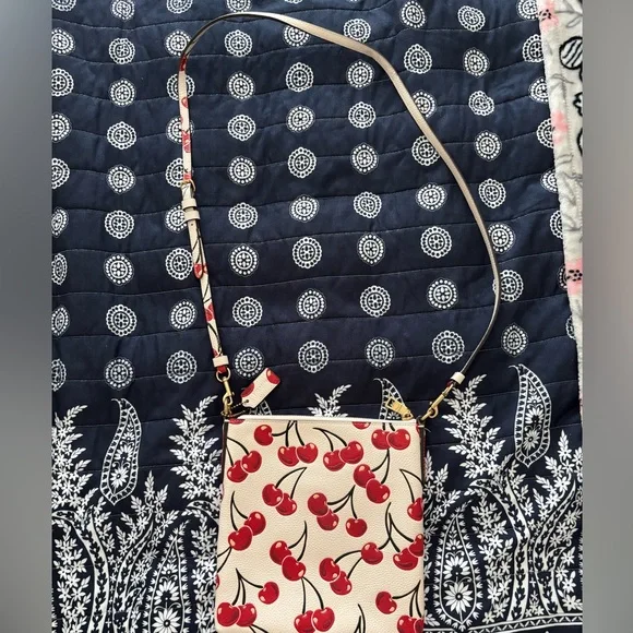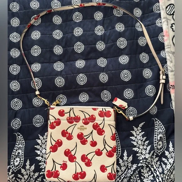 This Coach crossbody bag showcases a delightful cherry print, combining a cream backdrop with vivid red cherries for a striking look. Its compact design and adjustable strap make it a versatile accessory for any occasion. Elevate your style with this playful yet sophisticated bag. Pebbled leather.In excellent condition & shape.Smoke & pet free home.