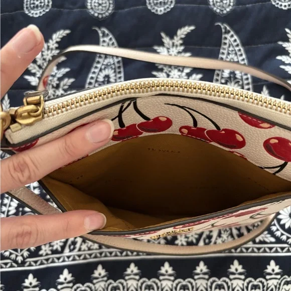 This Coach crossbody bag showcases a delightful cherry print, combining a cream backdrop with vivid red cherries for a striking look. Its compact design and adjustable strap make...