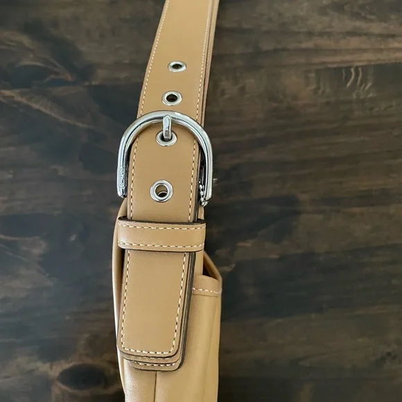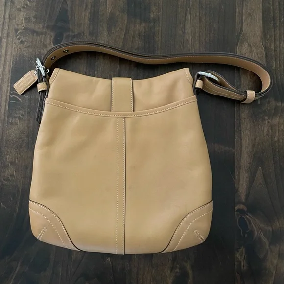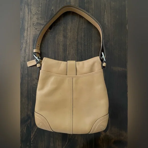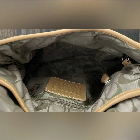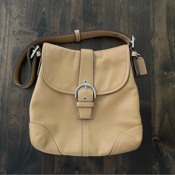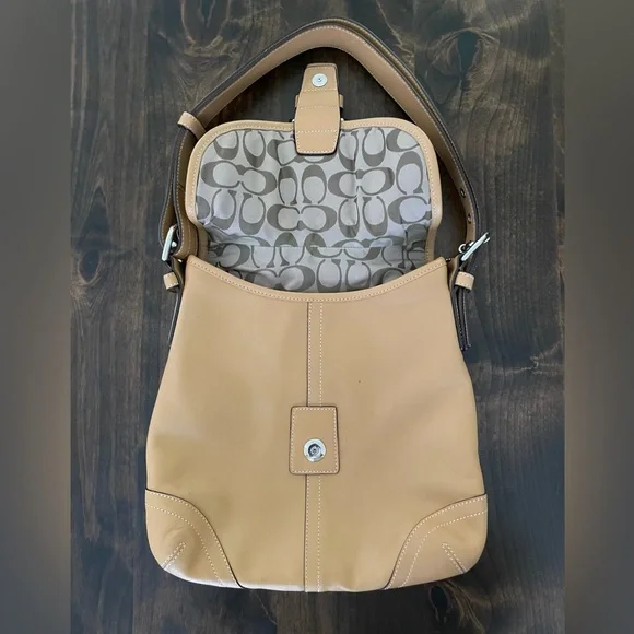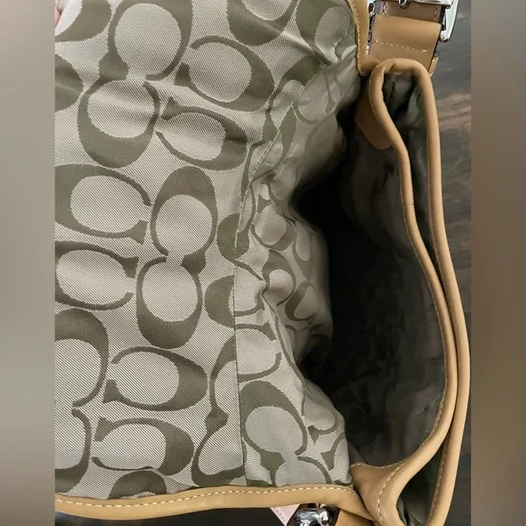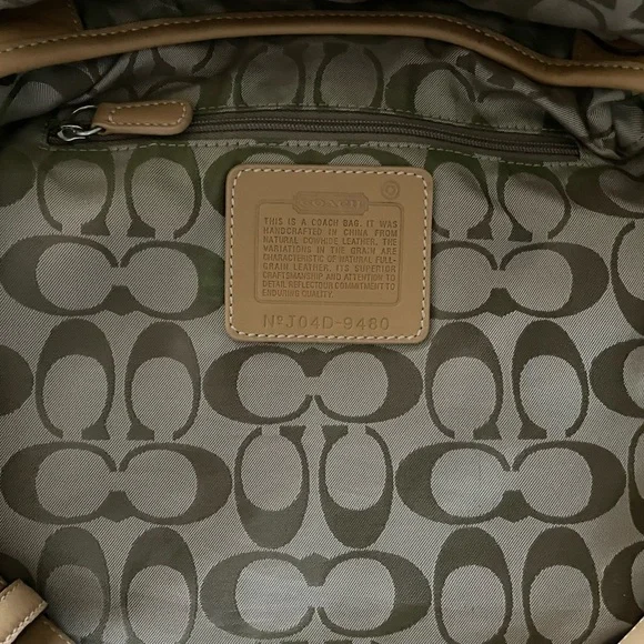 This Beautiful Beige Color Vintage leather bag was made in the 90’s. It has silver-tone hardware and a magnetic snap closure. The Signature Coach lining on the inside is in excellent condition. There are two sections inside and one zip compartment. Lots of room in this bag to store your essentials. Adjustable Crossbody Strap with a 22" drop. I purchased this bag when it was made in the 90’s. I am the original owner. There´s a little bit of wear on the back and a small blemish on the front underneath the flap. Gently used over the years.Overall, this bag is in very good condition! Measurements:Height: 10.5"Width: 11"Depth: 2"