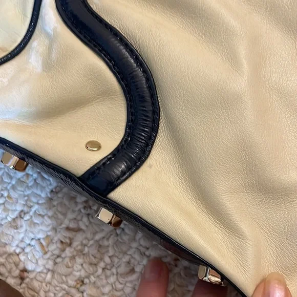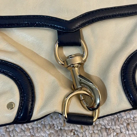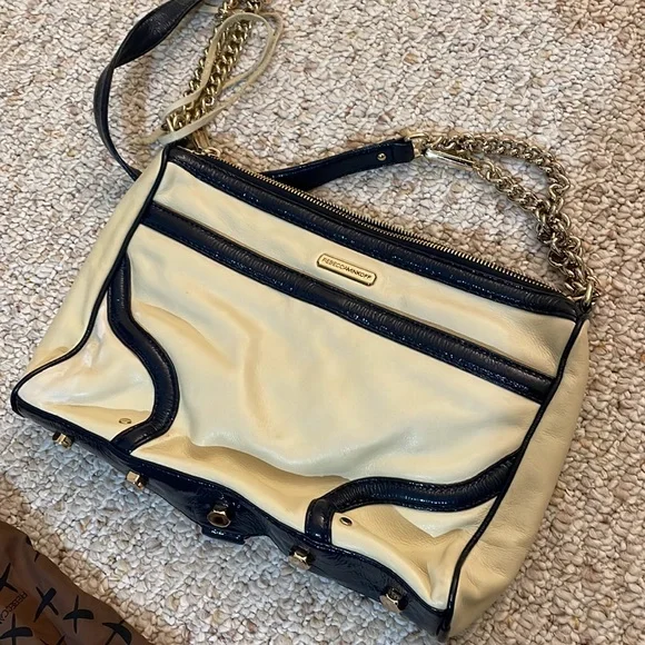 selling large creme leather Rebecca Minkoff max bag with navy blue patent trim-comes with dust bag-small mark on bottom back of bag