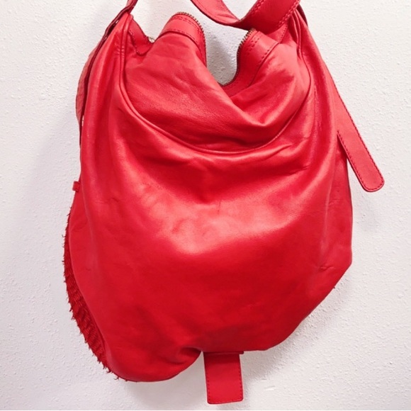 Aleanto Collezioni Italy Red Leather Large Shoulder Boho Bag, $599Smooth soft leather back with "feathered" leather frontGold plated metal hardware and grommetsFront buckle beltSide belts with loopsTop zip with tassel closureFront and back piping detailAccent stitchingDetachable and adjustable shoulder strap, 21" dropOne leather strap, 10" dropInside one side zip and one slide pocketsGold tone liningClean pre-owned .No smells no rips no funk