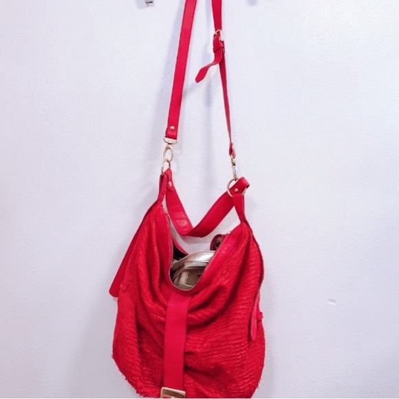Aleanto Collezioni Italy Red Leather Large Shoulder Boho Bag, $599Smooth soft leather back with "feathered" leather frontGold plated metal hardware and grommetsFront buckle...