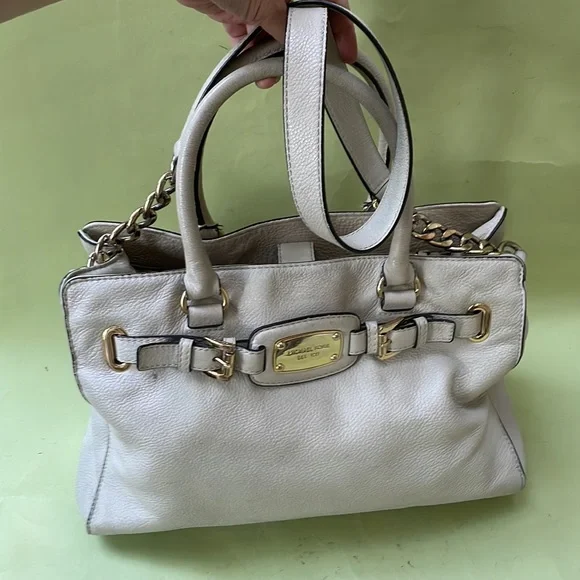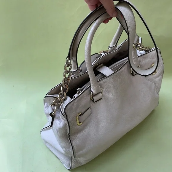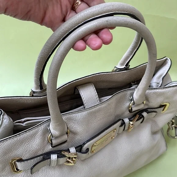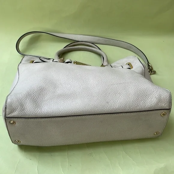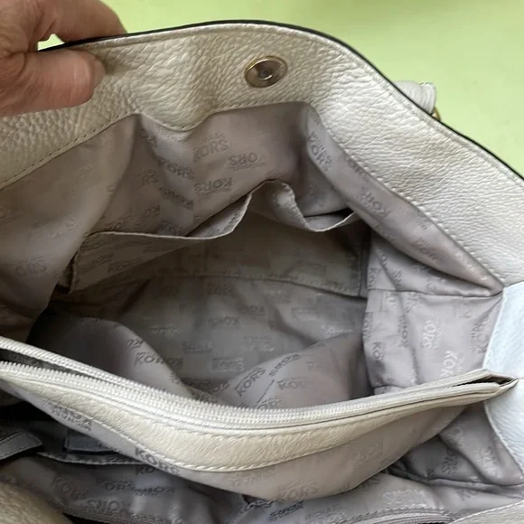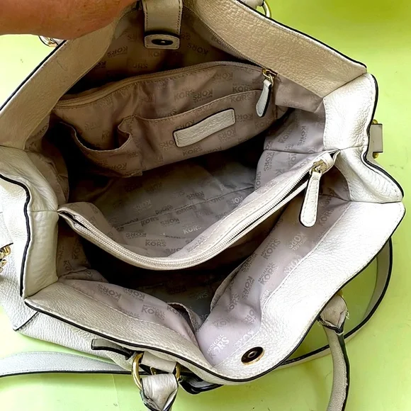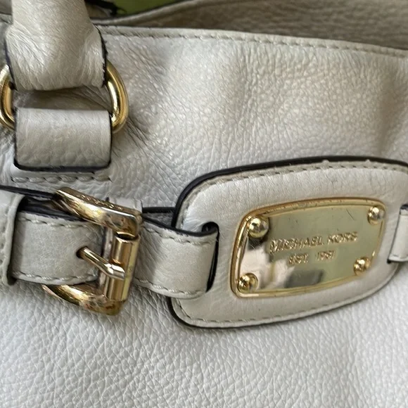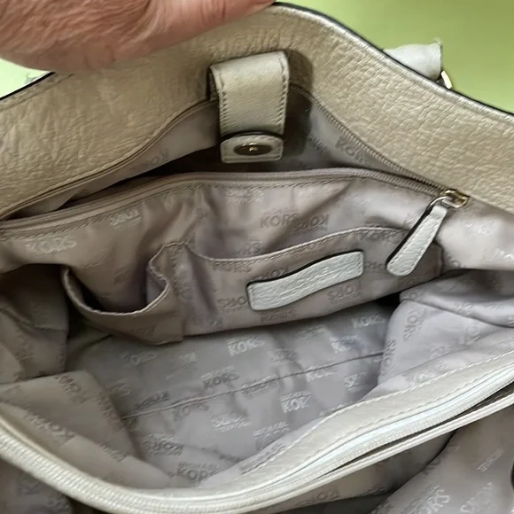Beautiful vintage light gray Michael Kors pebble leather shoulder bag with gold hardware. Three main compartments with several pockets inside. Magnet closer. Great used condition, some scratches, not that noticeable. Clean inside. Beautiful texture and lining . Measurements 14.5”(L),10”(H), 4.5”(D). Length of the shoulder strap is 39”. Length of the handles is 17”.