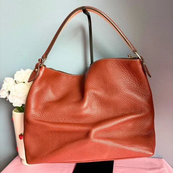Experience the perfect blend of style and practicality with this Dooney & Bourke hobo bag in a vibrant orange hue. Crafted from high-quality pebbled leather, it features a slouchy silhouette and gold-tone hardware for a touch of elegance. Ideal for everyday use, this bag offers both functionality and a chic aesthetic. Pristine condition!!! So many pockets inside. The leather and quality craftsmanship of this bag is amazing! Softest leather.
