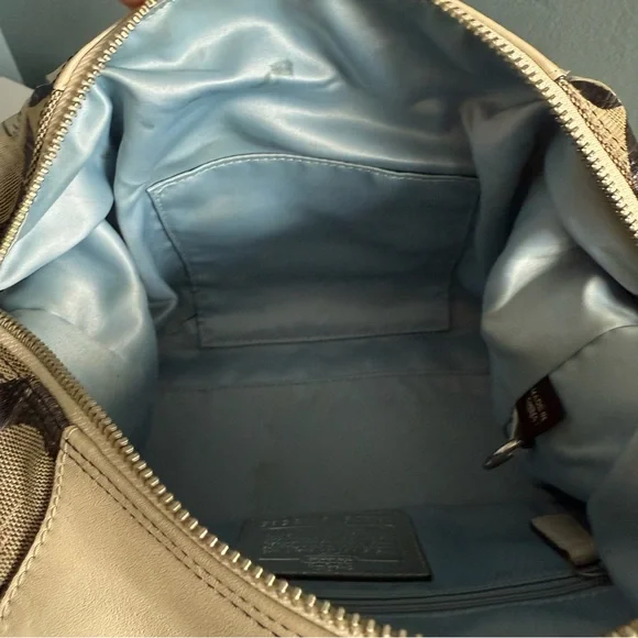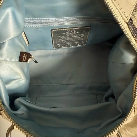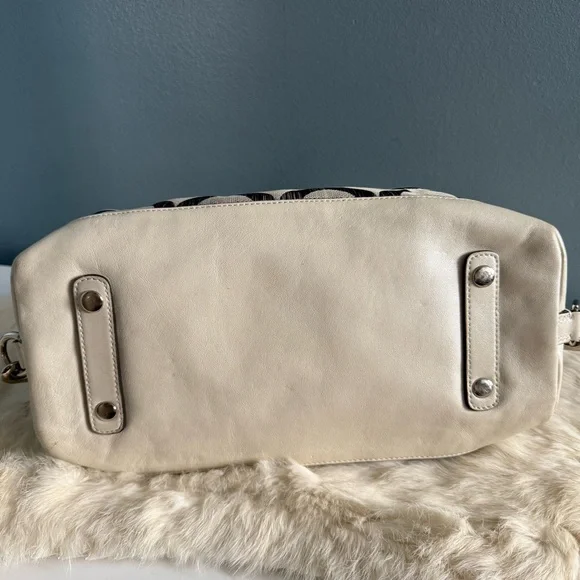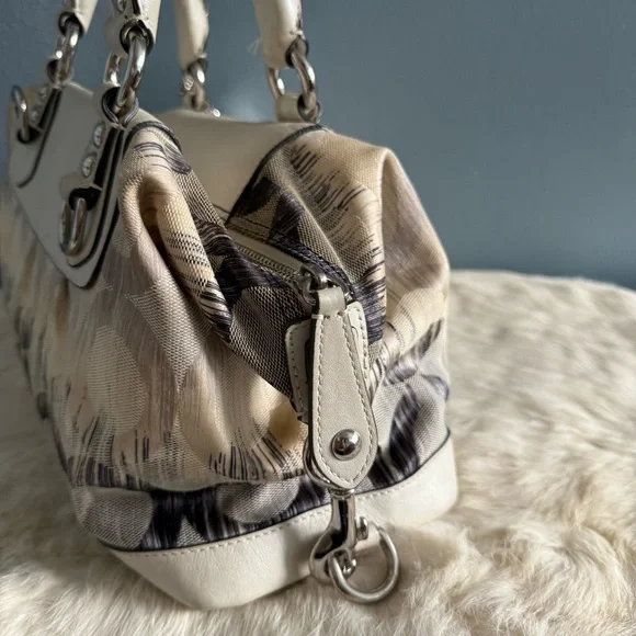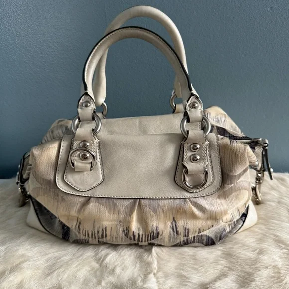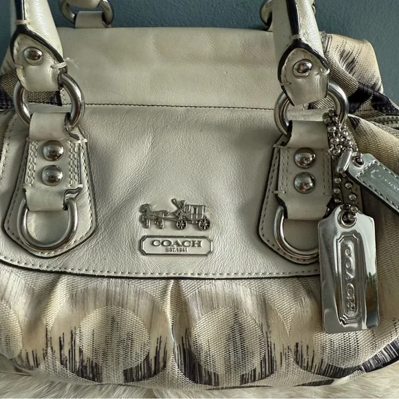 Coach Vintage Madison Signature Sabrina Cloth Satchel in beige. Measures approximately 12”W x 7”H x 7”D. Needs a cleaning but otherwise good preowned condition.